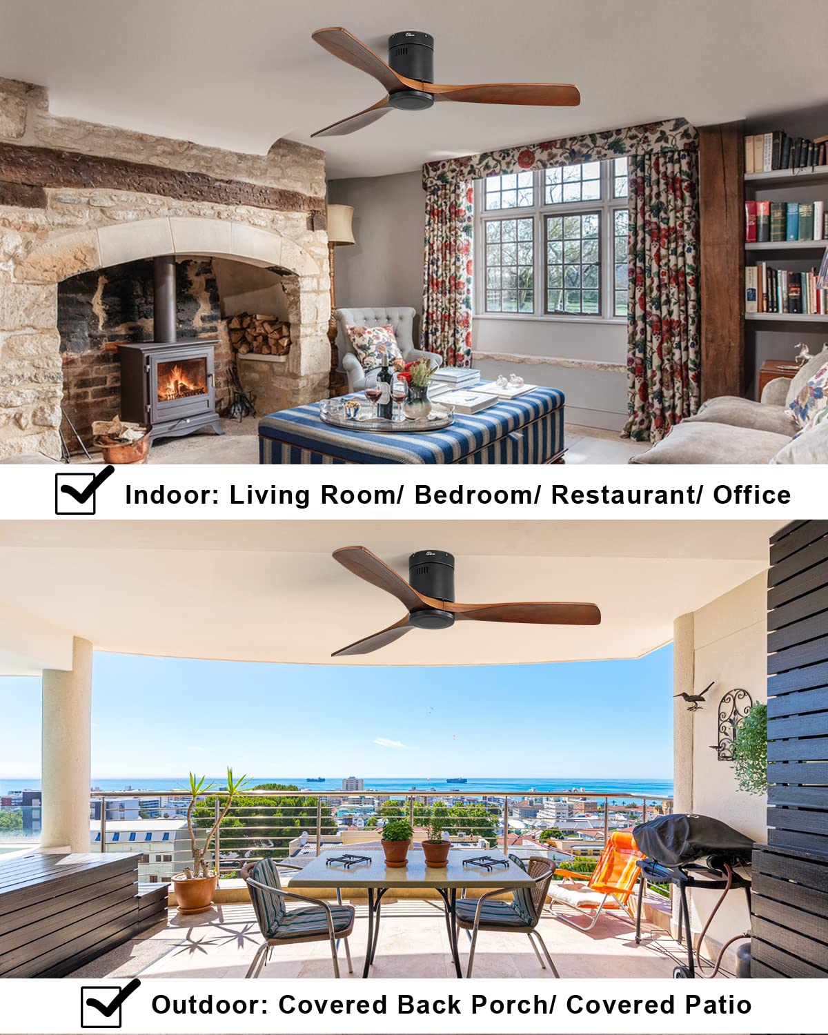 Sofucor Flush Mount Ceiling Fan Low Profile Ceiling Fan with Remote Control 52 Inch Outdoor Ceiling Fan 3 Reversible Walnut Wood Blades Noiseless DC Motor 6 Speed with Timer