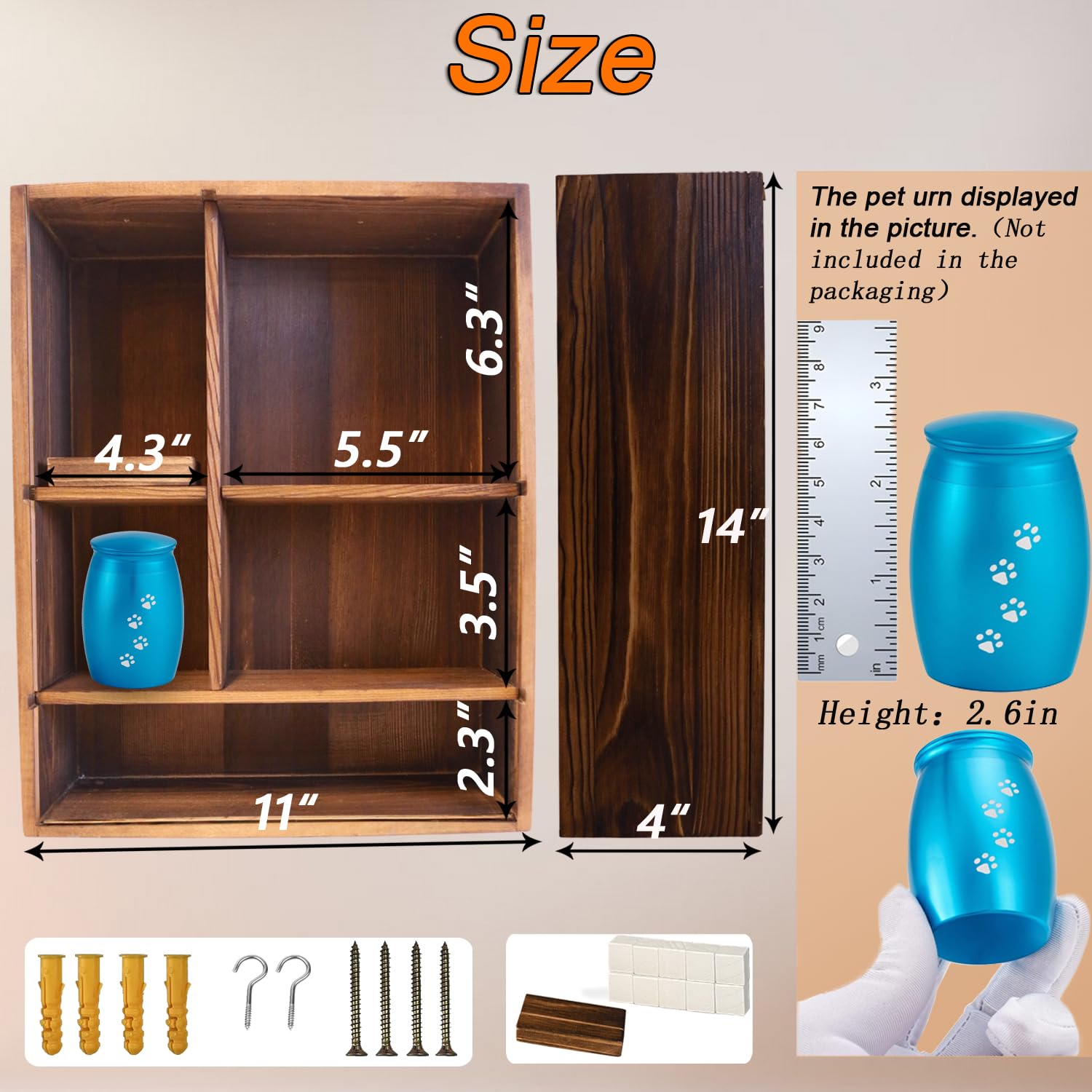 - đžăHigh-quality MaterialsăThis pet memorial shadow box is handmade of high-quality pine wood, and the solid wood texture is exquisite and elegant; the dust cover is made of 0.1-inch thick high-quality high-transparency plexiglass, which has a clear field of view and high-strength wear resistance to ensure the safety of the souvenirs inside; high-quality metal hooks, made of pure metal, spray-painted for corrosion resistance, can be used for a long time.