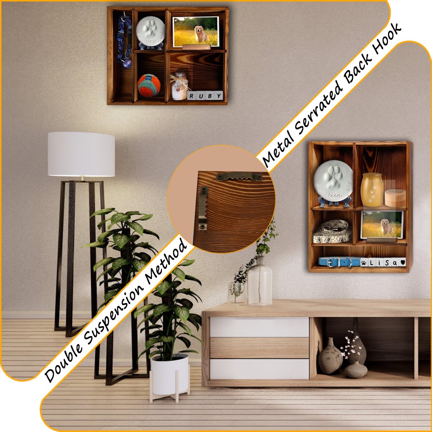 - đžăAssembly GuideăTwo sets of hooks are cleverly designed on the back of the pet shadow box, you can hang the pet shadow box on the wall vertically or horizontally. The interior of the shadow box adopts a live slot design, you can freely adjust the wooden board to put in paw print ink, collars, large pet plush toys and other souvenirs, optimizing space utilization.