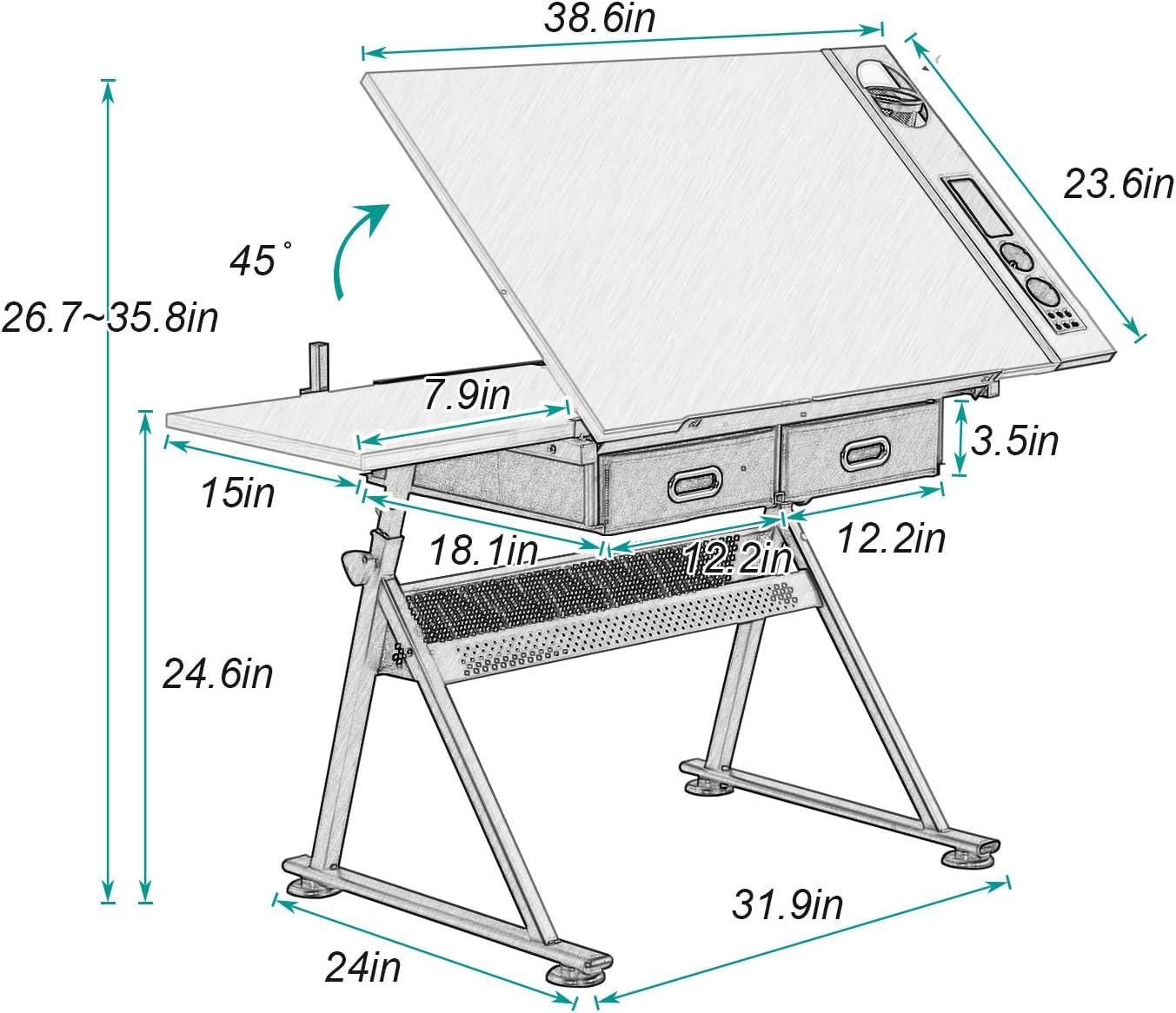 - 【MULTIFUNCTIONAL DRAFTING TABLE】- Drawing table: 46.5"L x 23.6" Wx 26.7-35.8''H. Table surface: 38.6" x 23.6". Side table on the left can be pulled out for placing laptop and iPad to display pictures as drawing references, when not use, just slid it under the tabletop.The craft table offers double work surfaces, perfect for artist work between multiple tasks.