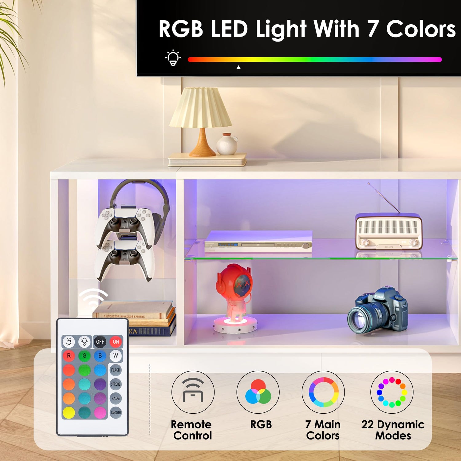 - 【CUSTOMIZE STORAGE SPACE】This LED TV stand for living room has 5 open storage compartments for your needs. It is also equipped with earphone hooks and handle hooks,especially designed for your electronics needs, for AV components, cable boxes, Xbox one, CDs or other suppliers.The middle glass shelf can be adjusted to different heights.