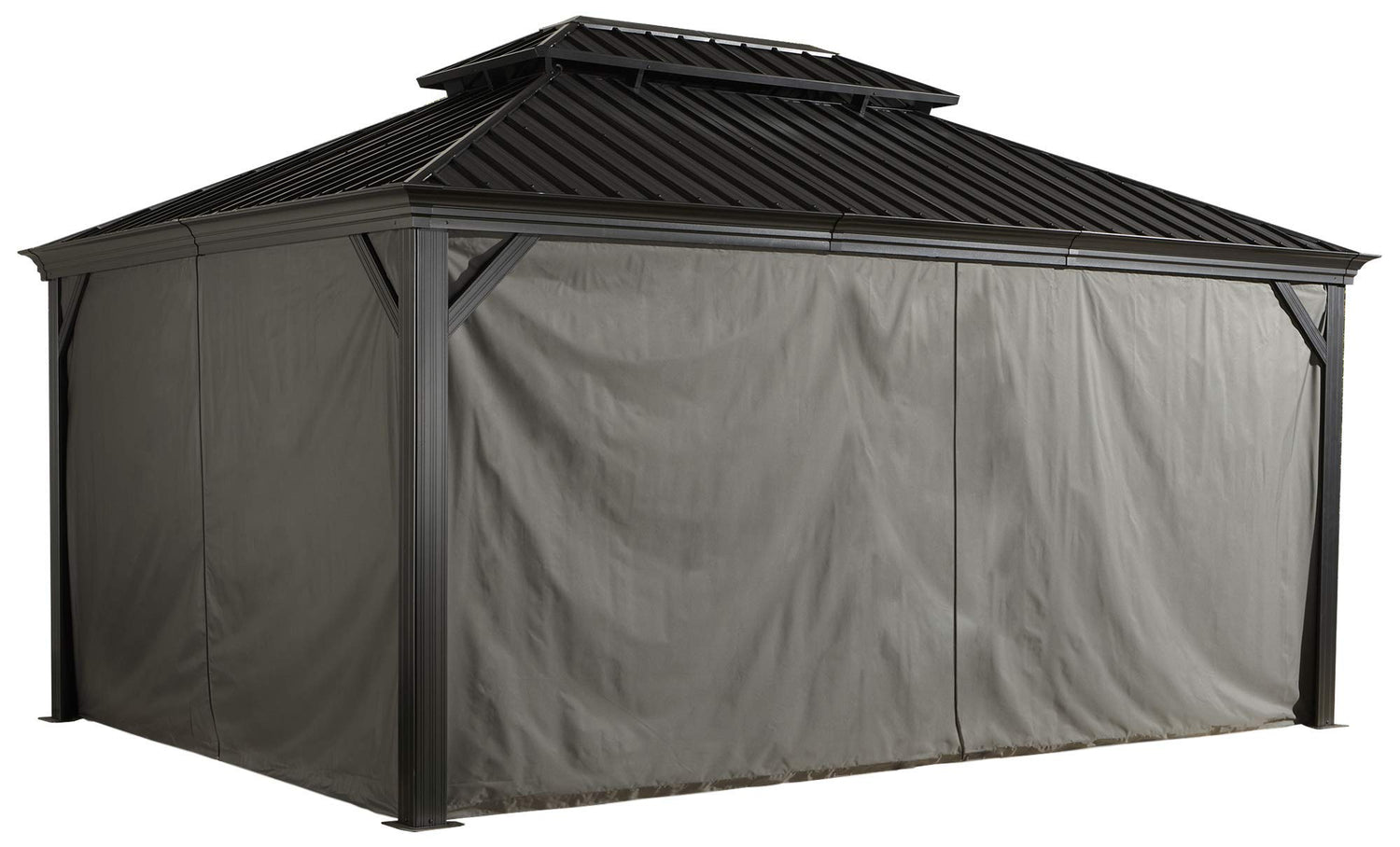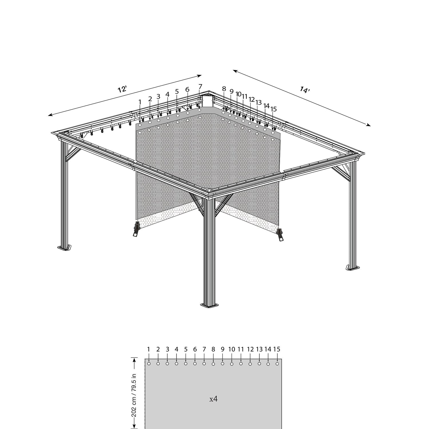 Details: These Sojag outdoor summer curtains are the perfect accessory for your sun shelter. These curtains are made of high quality spun polyester, don't require ironing and have greater wash-ability than cotton curtains. The outdoor gazebo curtains are also water-resistant and meet CPAI-84 compliance for flame resistance. These multi-purpose curtains are more than just mosquito netting. They provide shade from the sun on a hot summer day and also add privacy to your outdoor gazebo. Compatible with Sojag models Monaco, Messina, or Mykonos sized 12' x 14' only. Gazebo not included. With a 1 year warranty, you can be confident in your Sojag outdoor gazebo curtains purchase. ASSEMBLED DIMENSIONS: 12' x 14'COLOR: GreyINCLUDES:(4) Curtain panels(4) Curtain hooks