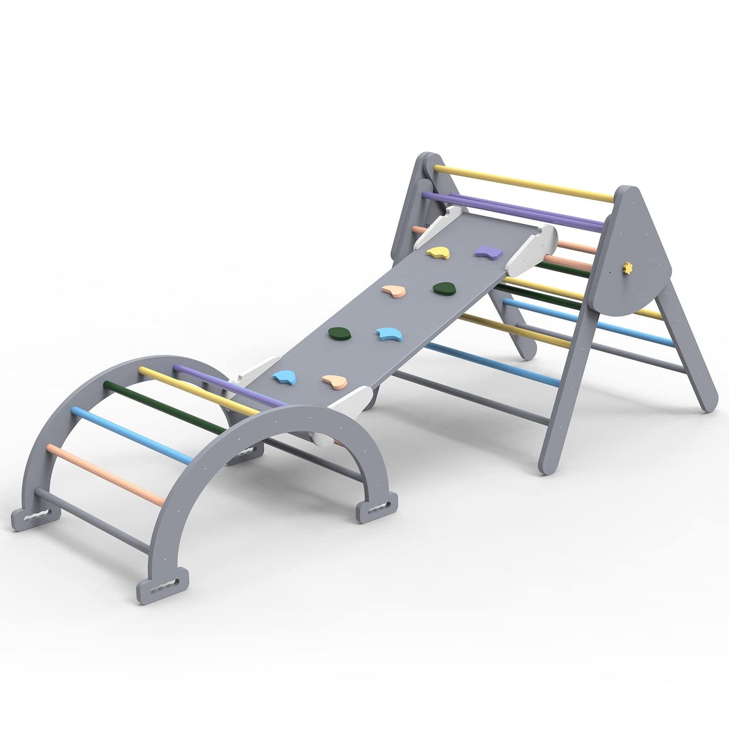 - 【6 in 1 Montessori Climbing Toys Set】- The Montessori climbing toys set come with pikler triangle climber, climbing arch and rock climbing ramp. You can combine the triangle climber and climbing ramp as a usual climbing toy, also can turn the ramp to other side to make a slide. All the parts of this pikler set can combine as a balanced climbing toy. The Montessori climber set provides children with a variety of ways and difficulties of play, give you kids even more opportunities to have fun.