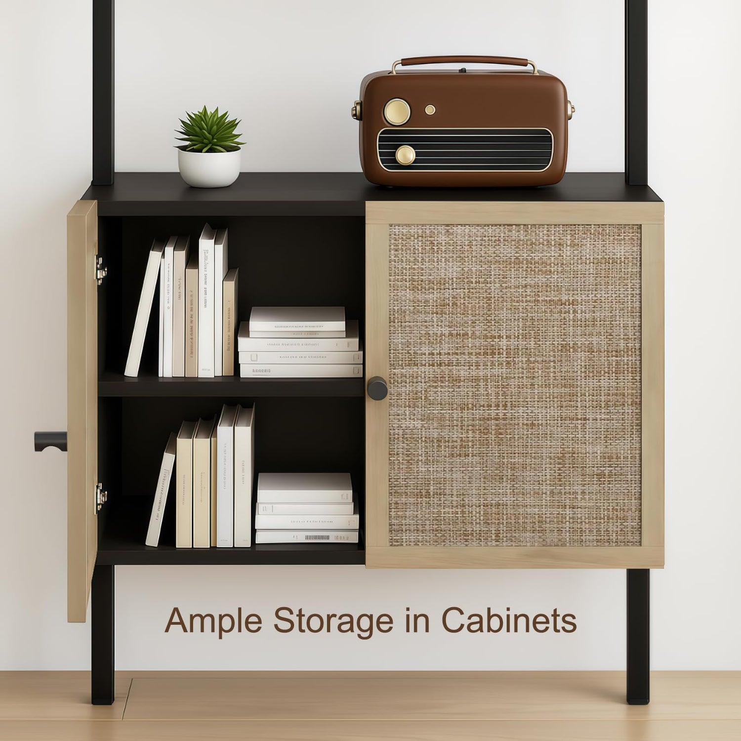 SOLACE FURNITURE Rattan Bookcase, 6 Tier Ladder Bookshelf with Rattan Cabinet, Wall Mount Tall Bookshelves and Bookcases with Metal Storage Shelves Display for Living Room Bedroom Home Office, Black