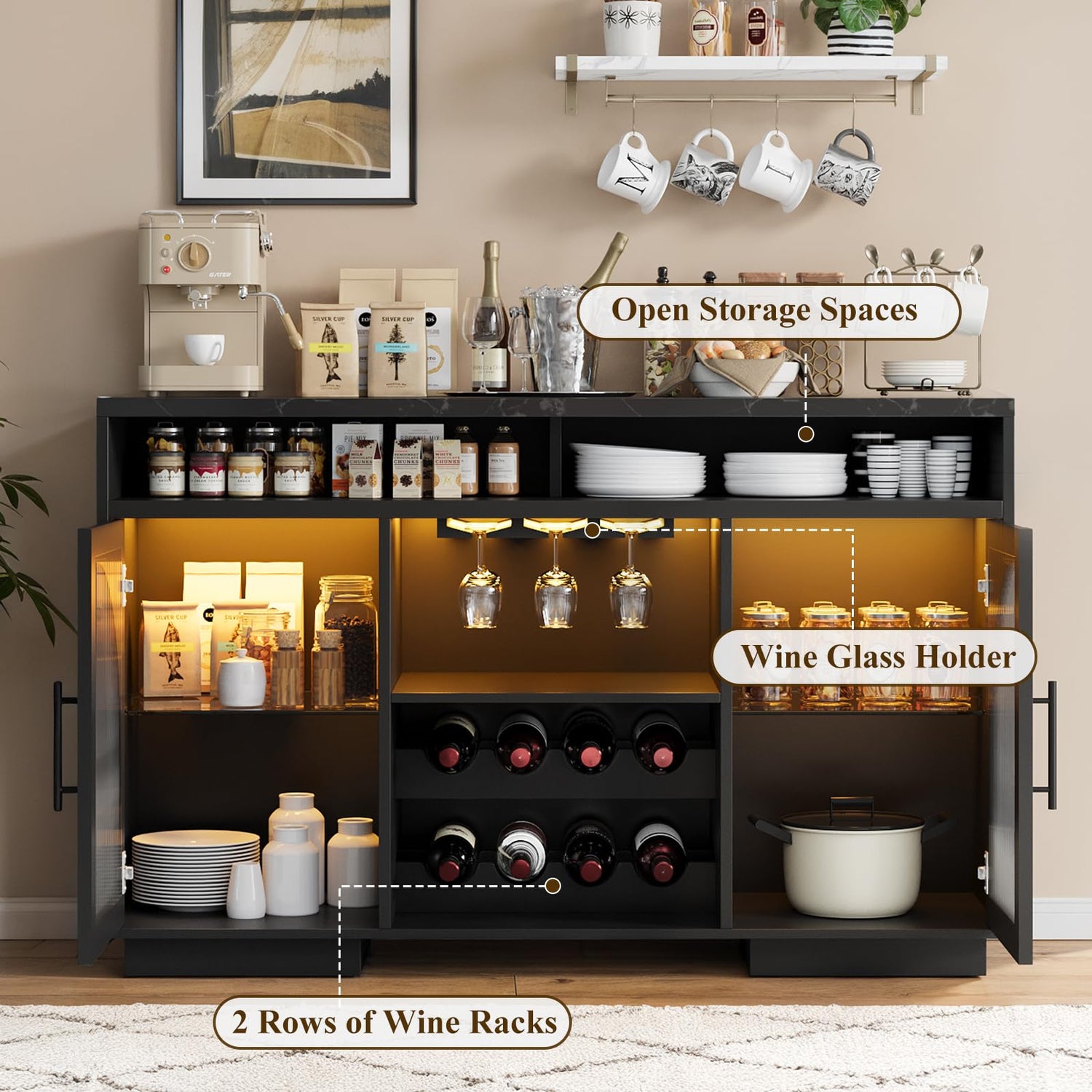 SOLACE FURNITURE Sideboard Buffet Cabinet, 54" Kitchen Cabinet with LED Lights & Arched Glass Doors, Tall Bar Cabinets with 2 Adjustable Shelves, Wine Rack & Storage Table for Dining Room, Black