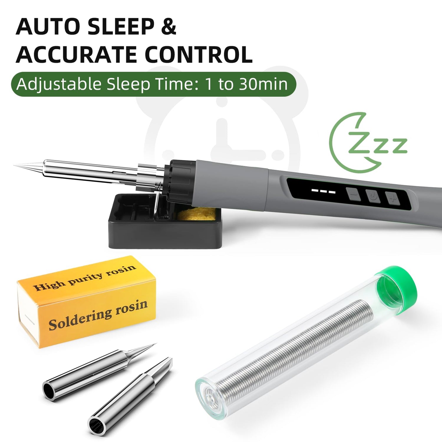 - 【AUTO SLEEP & COMBINATION LOCK】: After the sleep mode is activated, the soldering pen automatically enters the sleep mode (1-30 minutes) when not in use. An onoff switch allows the user to turn off the soldering iron when not in use, and a combination lock can also be set. These safe and energy-efficient features also prevent children from accidentally touching the iron.