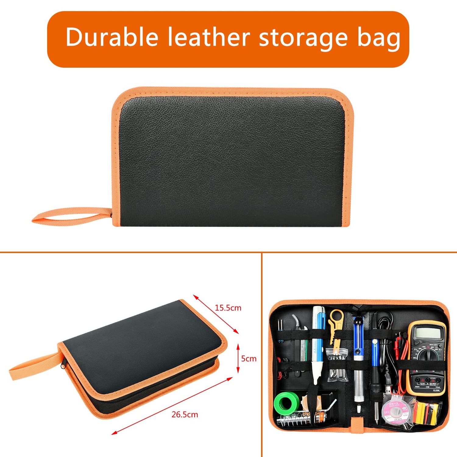 - 【18-In-1 Soldering Iron】Soldering iron kit comes with soldering iron,Desoldering Pump,Soldering Iron Tips,Soldering Wire,Soldering Iron Stand,Tweezers,Multimeter,Mini Wire Cutter,Electronic Wire,PU Carry Bag,solder paste, heat shrink tubing,pen-shaped screwdriver,electric pen,etc.