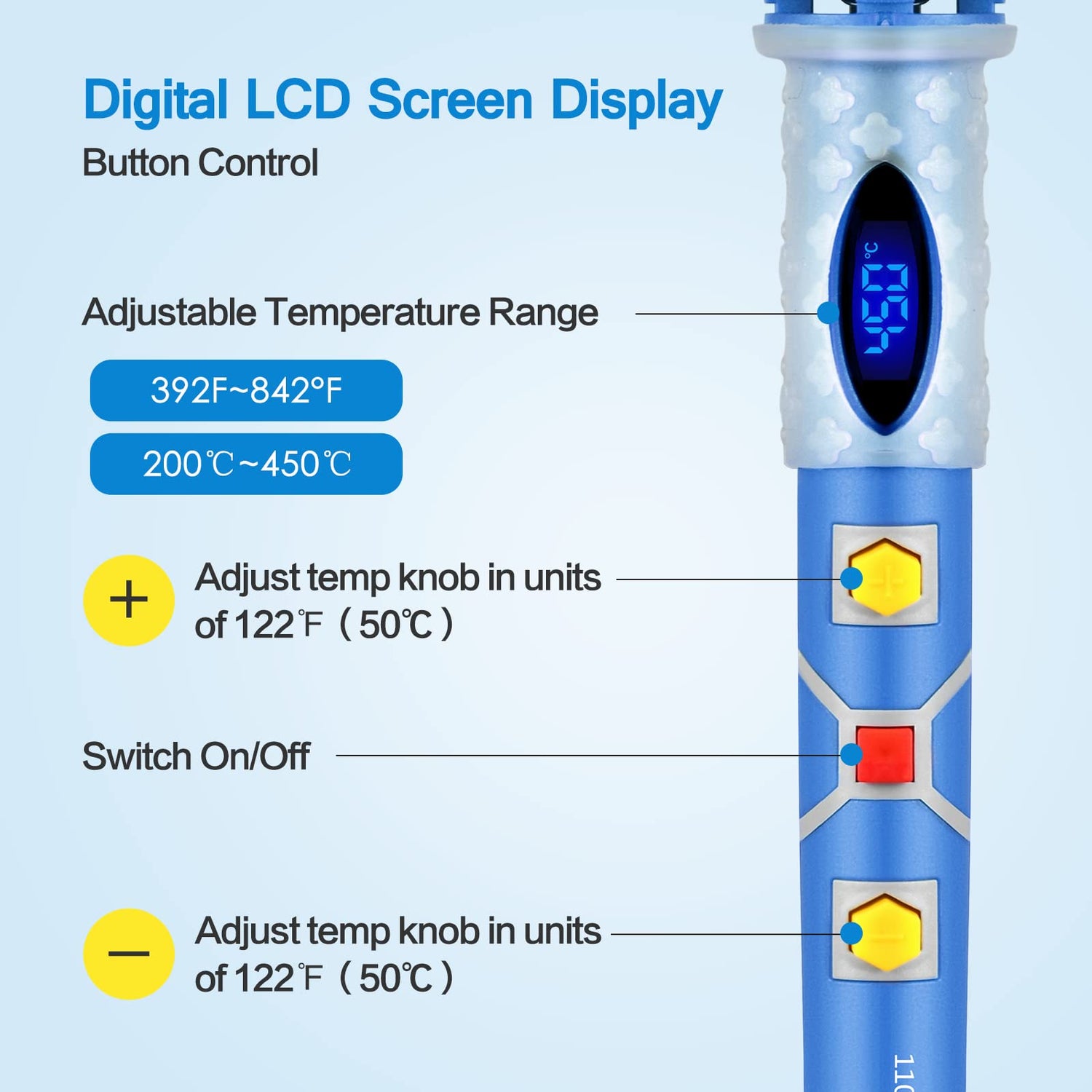 - ✒Humanized Design:This soldering iron design with high definition LCD screen display, Adjustable temperature design(from 200 to 450℃), adjust the temperature according to your need with the “+” and“-” buttons on the electronic soldering iron. The four ventilation holes on the welding tool help cool down quickly. Good soft rubber handle, more durable and comfortable, the stability can protect the welding object in high temperatures.