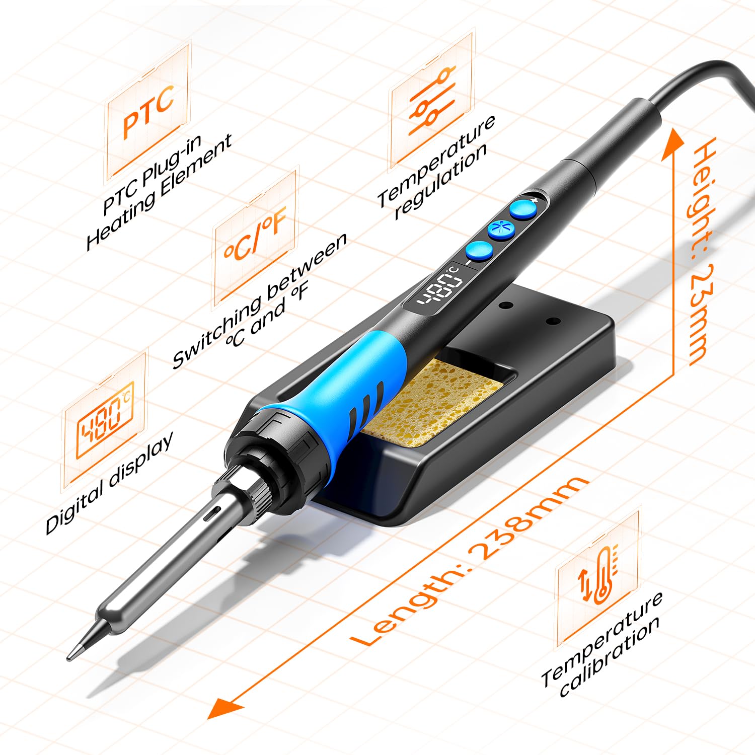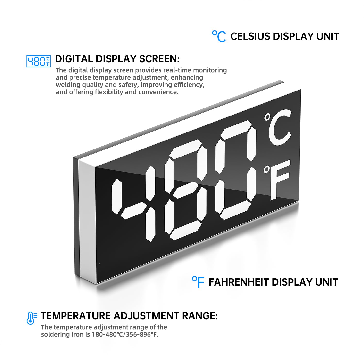 - 【Technical innovation】The soldering iron is upgraded to 90W high power, which can make the iron warm up quickly; this iron can adjust the temperature accurately, the temperature can be set flexibly to 180℃-480℃