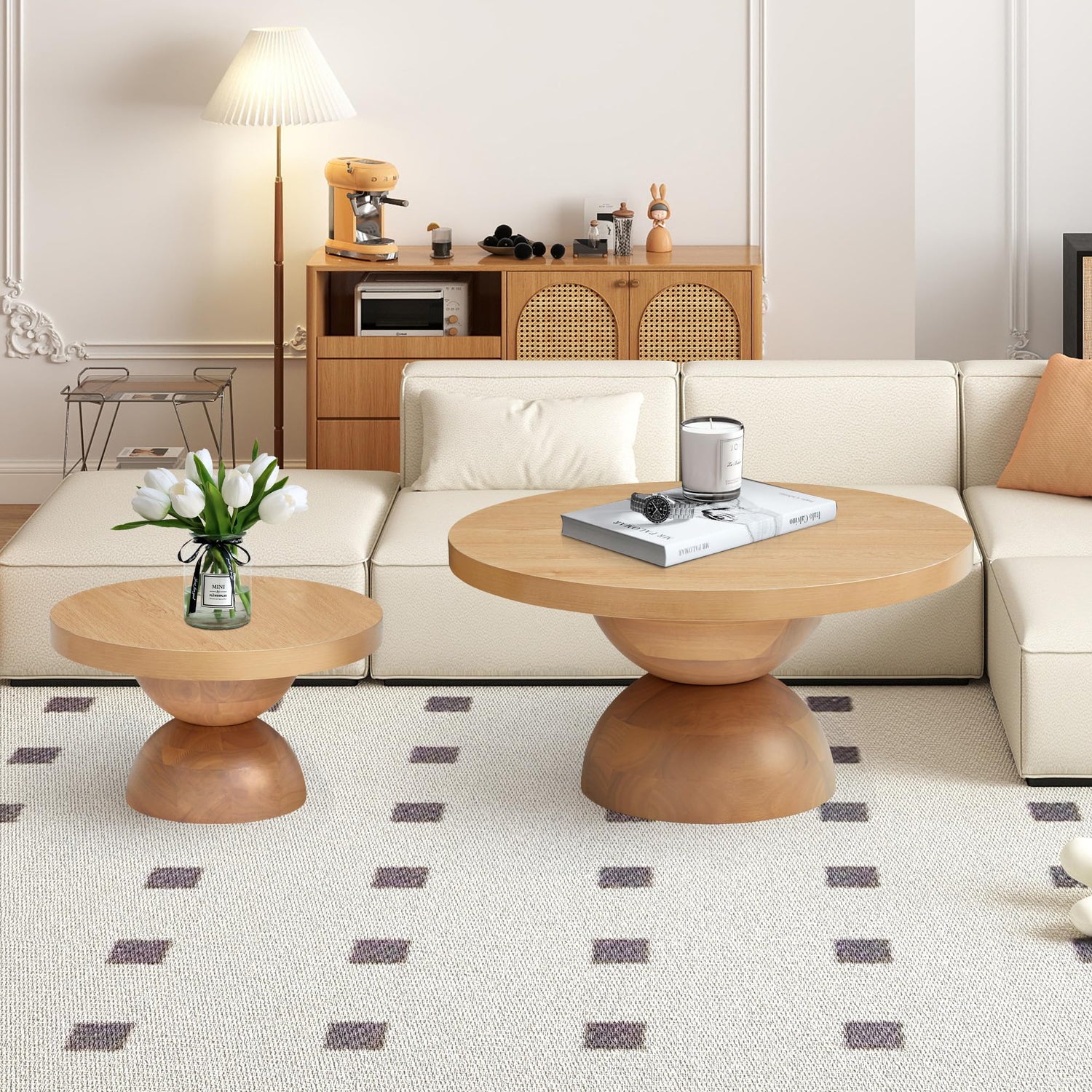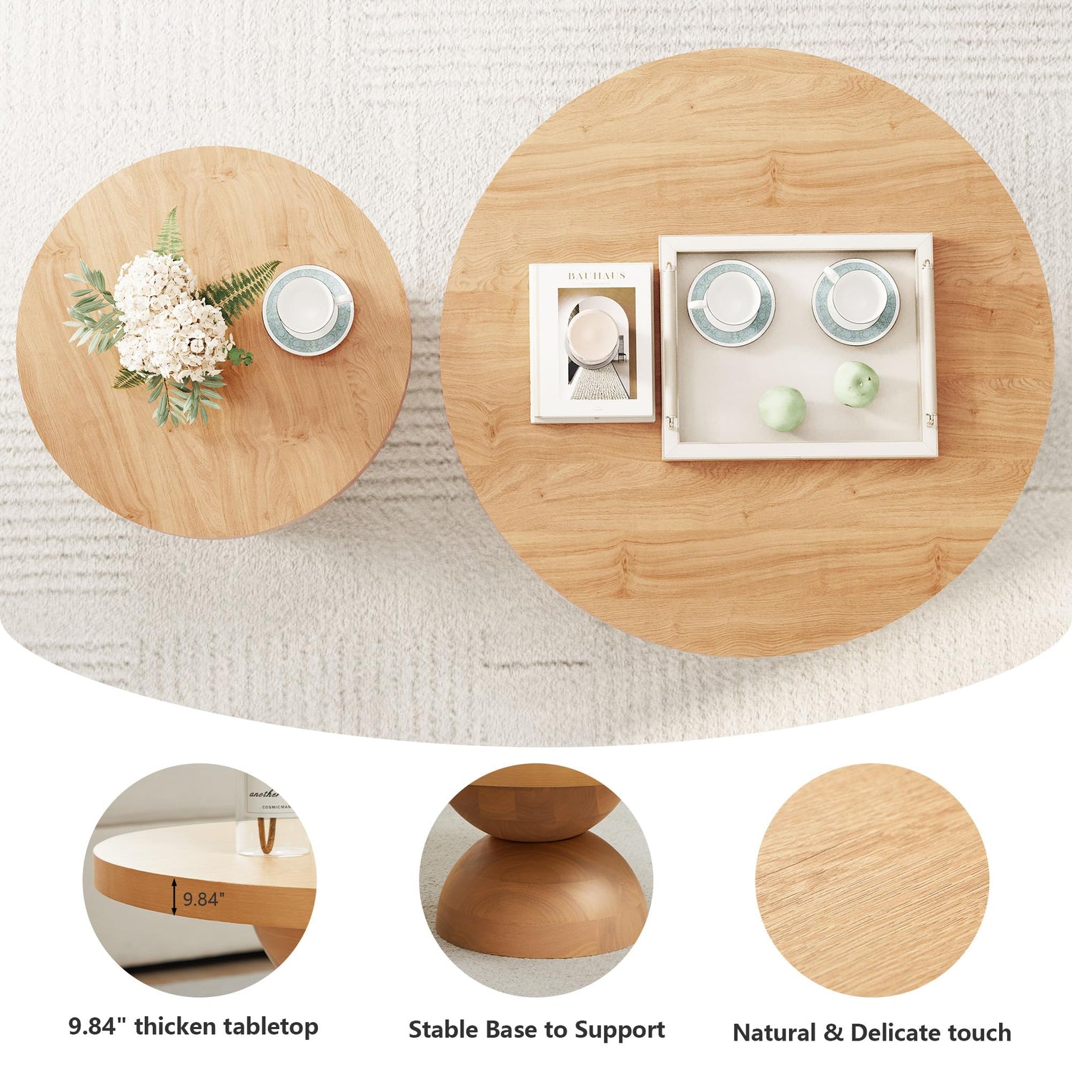 - 【Functional & Flexible】Use the larger table as a coffee table centerpiece and the smaller one as a side table or end table next to your sofa or bed. Their neutral finish blends effortlessly with Scandinavian, Japandi, and mid-century modern interiors.