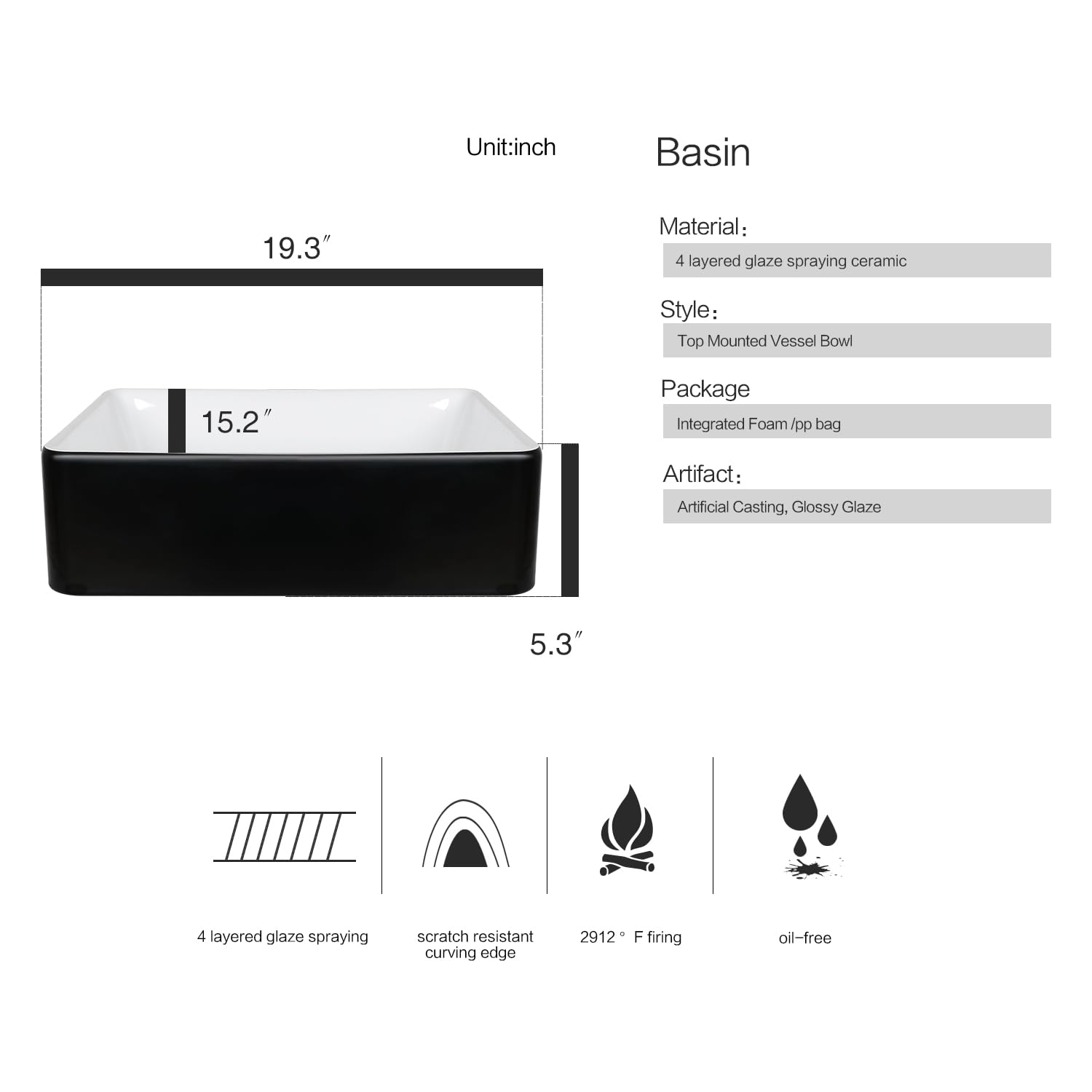 - 【Product Details】 Bathroom Vanity is made of MDF wood. Self-assembly needed. Ship in TWO packages and the arrival time may be different. Packages include the Bathroom Vanity, sink, faucet, pop-up drain, hot/ cold lines, and mounting hardware. Bathroom Vanity size: 18.5"D x 28"W x 16"H; Sink dimension:19.3" x 15.2" x 5.3" (L x W x H); Bowl thickness: 0.5".