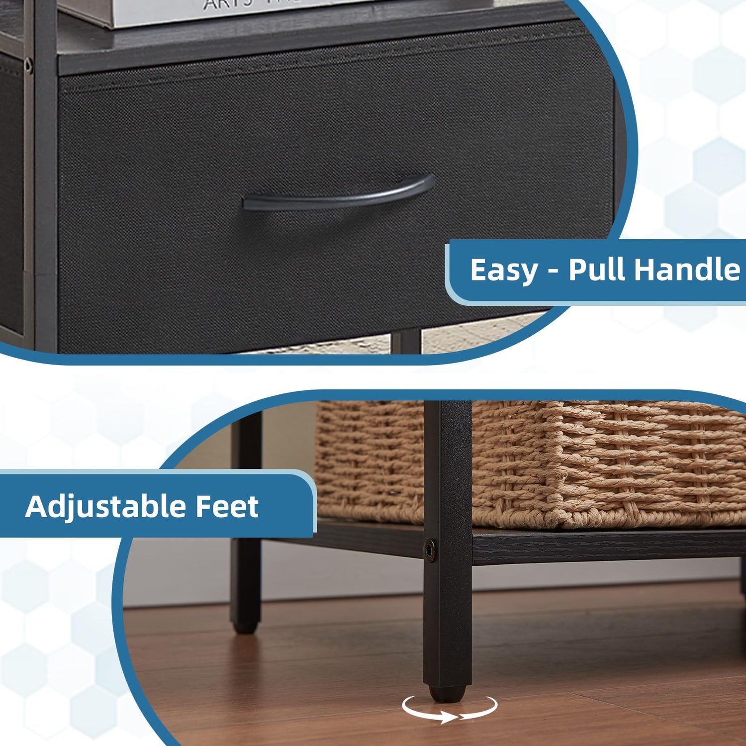 - Multi-functional Storage: This nightstand serves as a charger and bedside table all in one with 2 USB ports, 2 standard sockets, 1 fabric drawers, and 2 open shelves for books or décor.