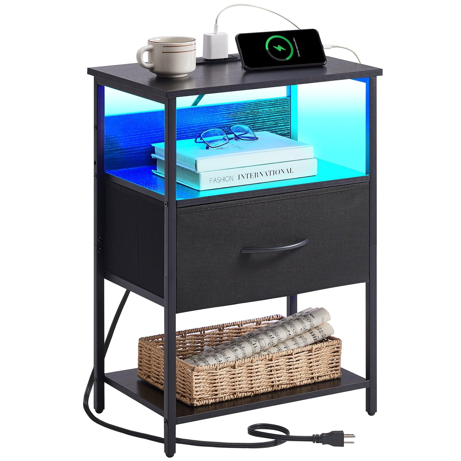 Somdot Black Nightstand with Charging Station and LED Light for Bedroom, Bedside Table End Table for Dorm Guest Room Bedside Kids Laundry Closet Entryway Hallway, Black