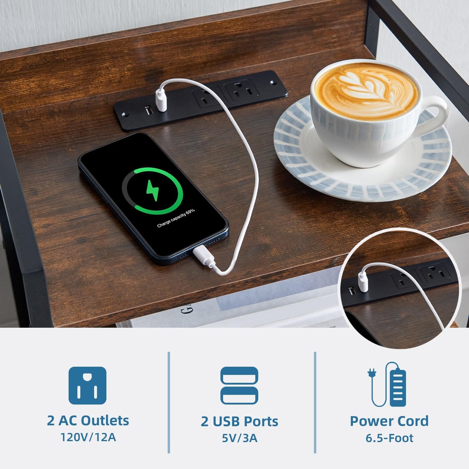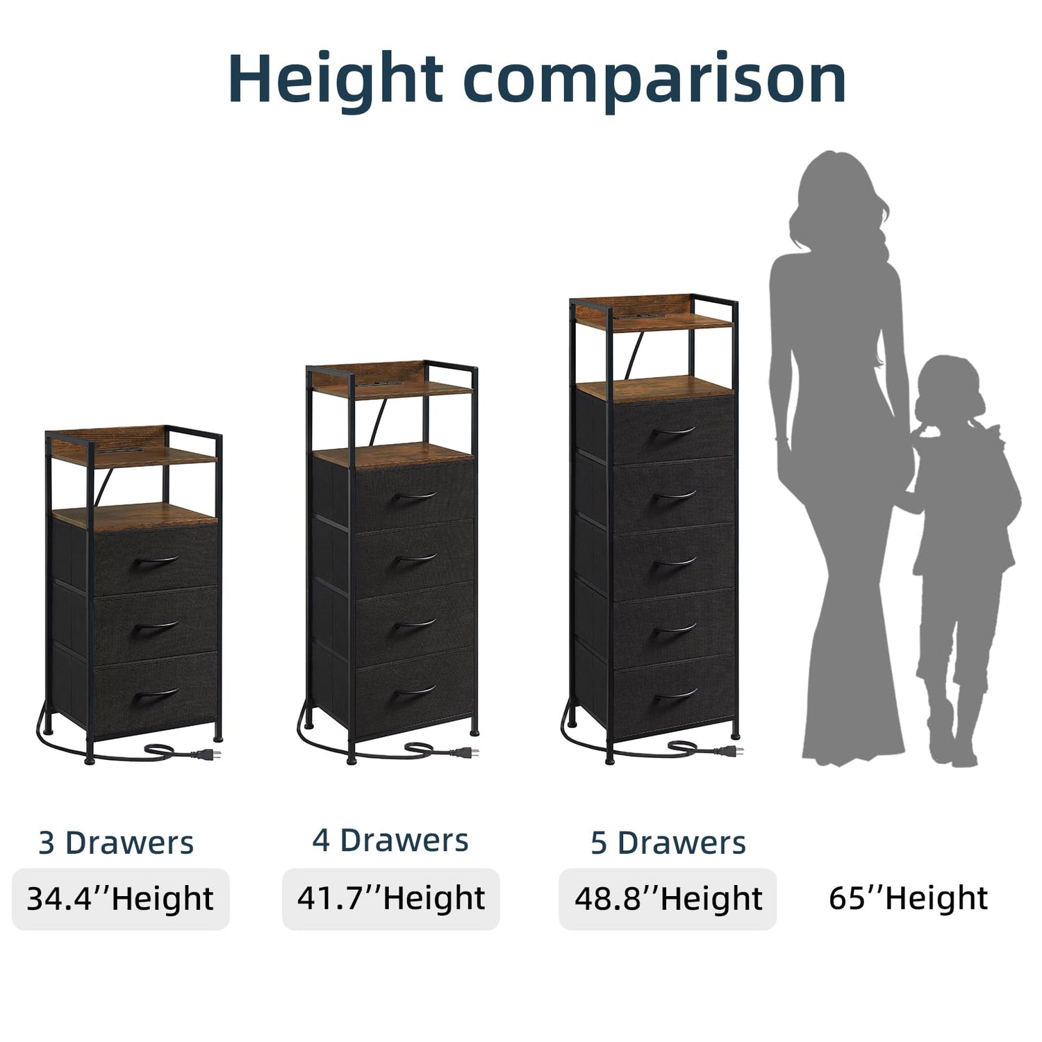- Multi-functional Storage: This nightstand serves as a charger and bedside table all in one with 2 USB ports, 2 standard sockets, 5 fabric drawers, and a open shelf for books or décor.