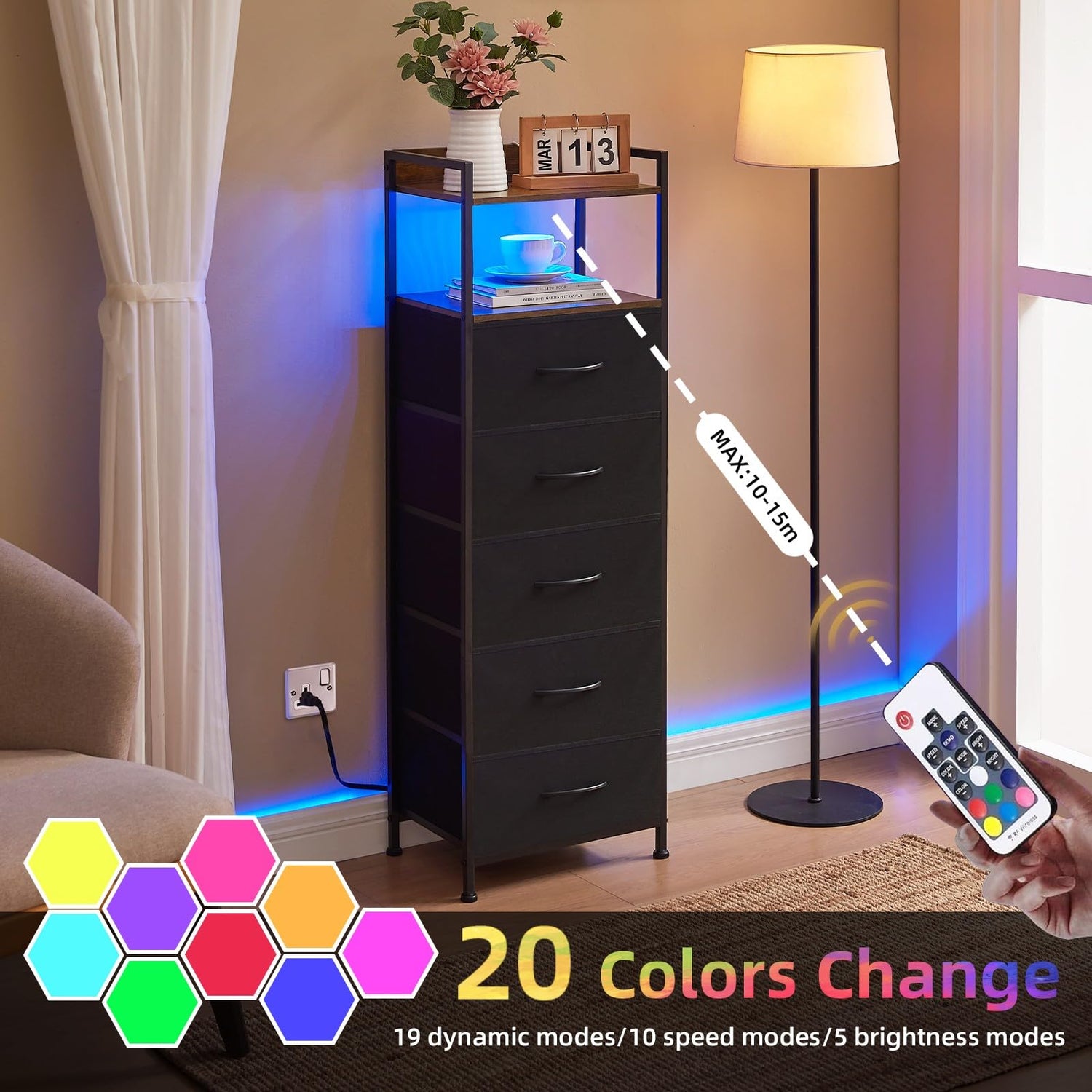 Somdot Black Nightstand with Charging Station and LED Light for Bedroom, Tall 5 Drawers Dresser with Fabric Bins for Bedside Kids Dorm Room Closet Laundry Entryway, Black Rustic Brown