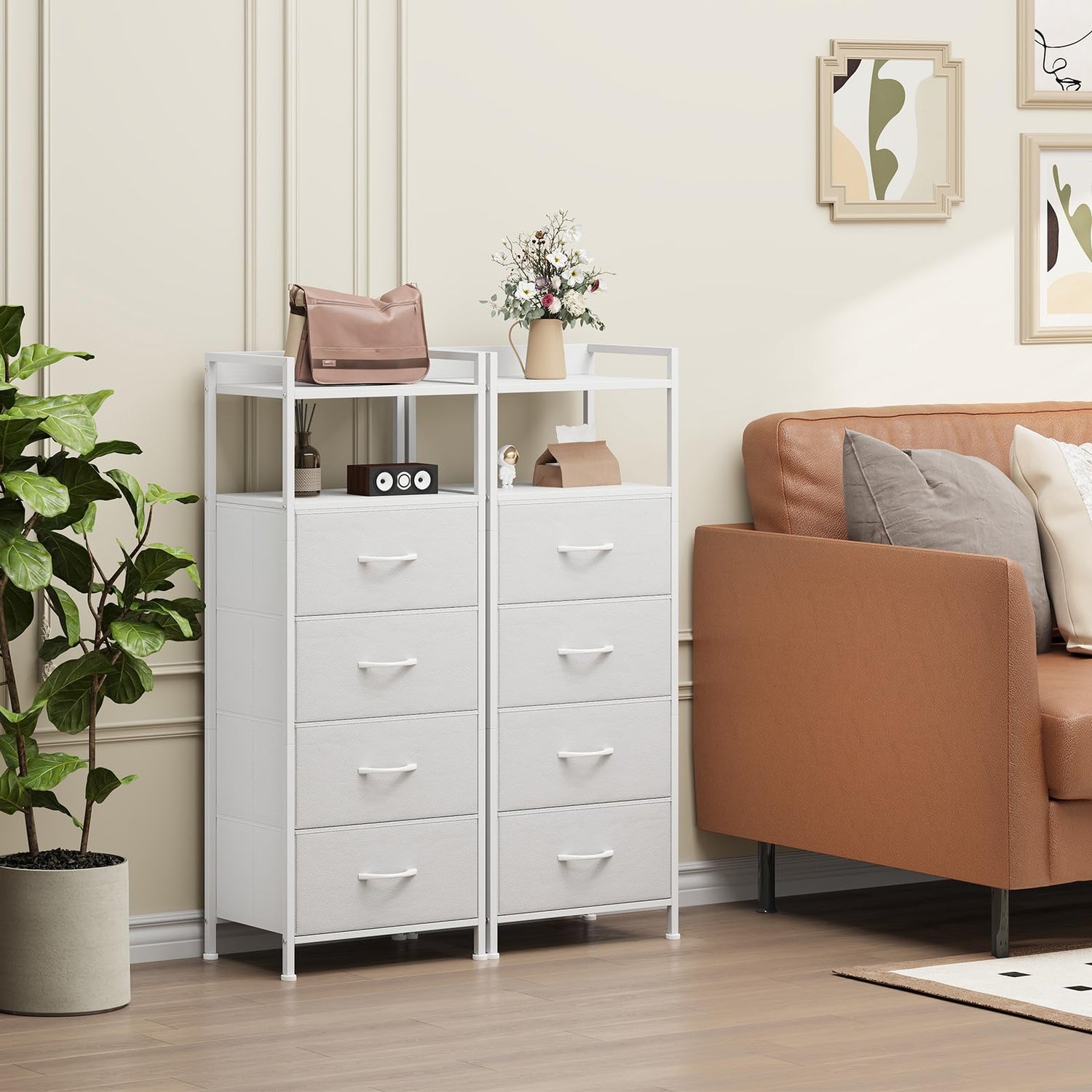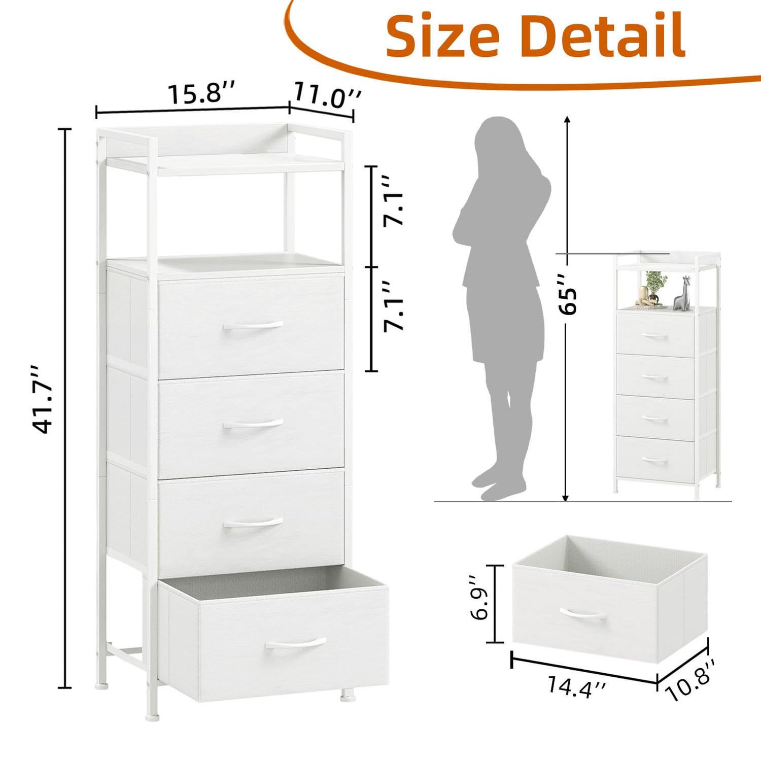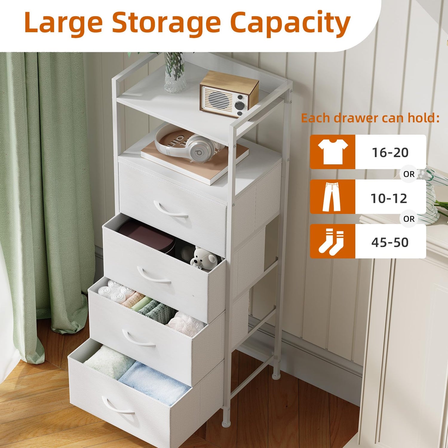 - 【Multi-functional Storage】This dresser features foldable storage drawers. Each fabric drawer offers large storage space, perfect for organizing clothes, toys, socks, underwear, scarves, blankets and other accessories. The drawers are made of PVC fabric, lightweight and durable, and won't pinch hands, also safe for to use