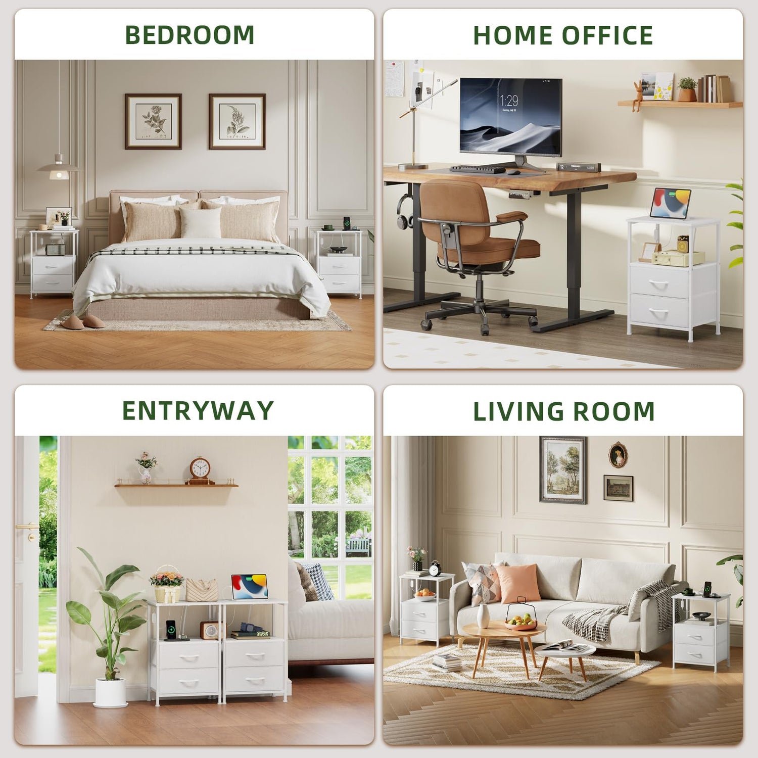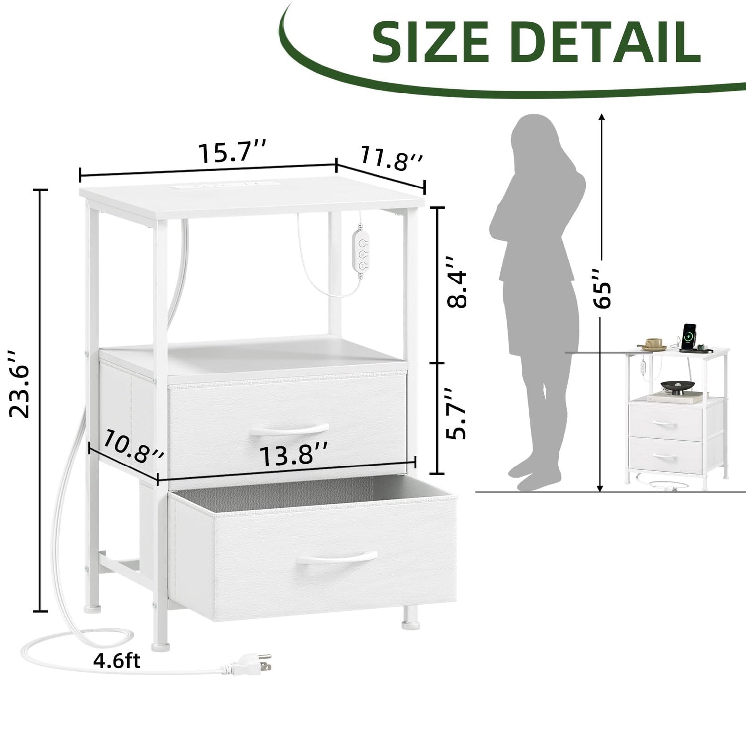 - Multi-functional Storage: This nightstand serves as a charger and bedside table all in one with 2 USB ports, 2 standard sockets, 2 fabric drawers, and a open shelf for books or décor.