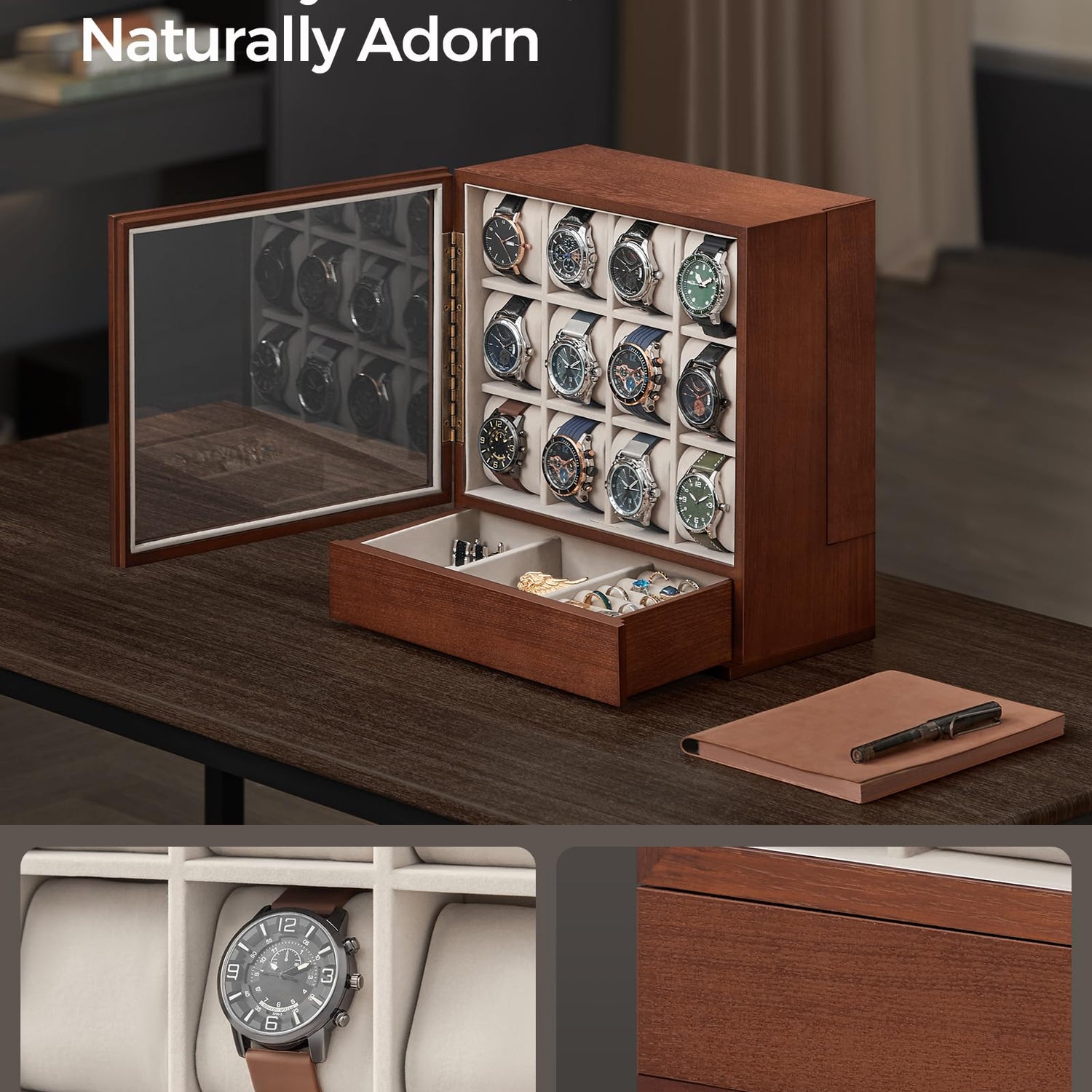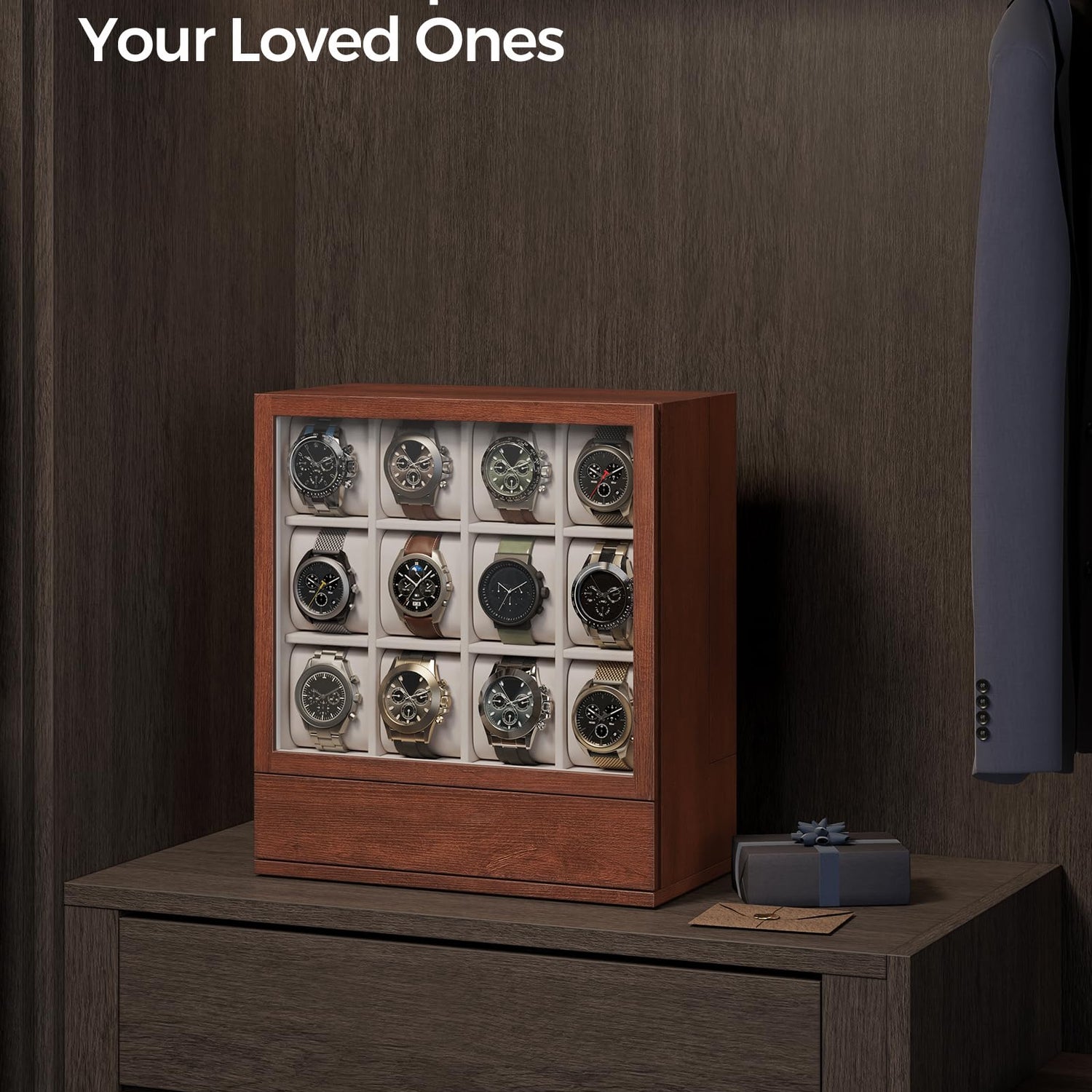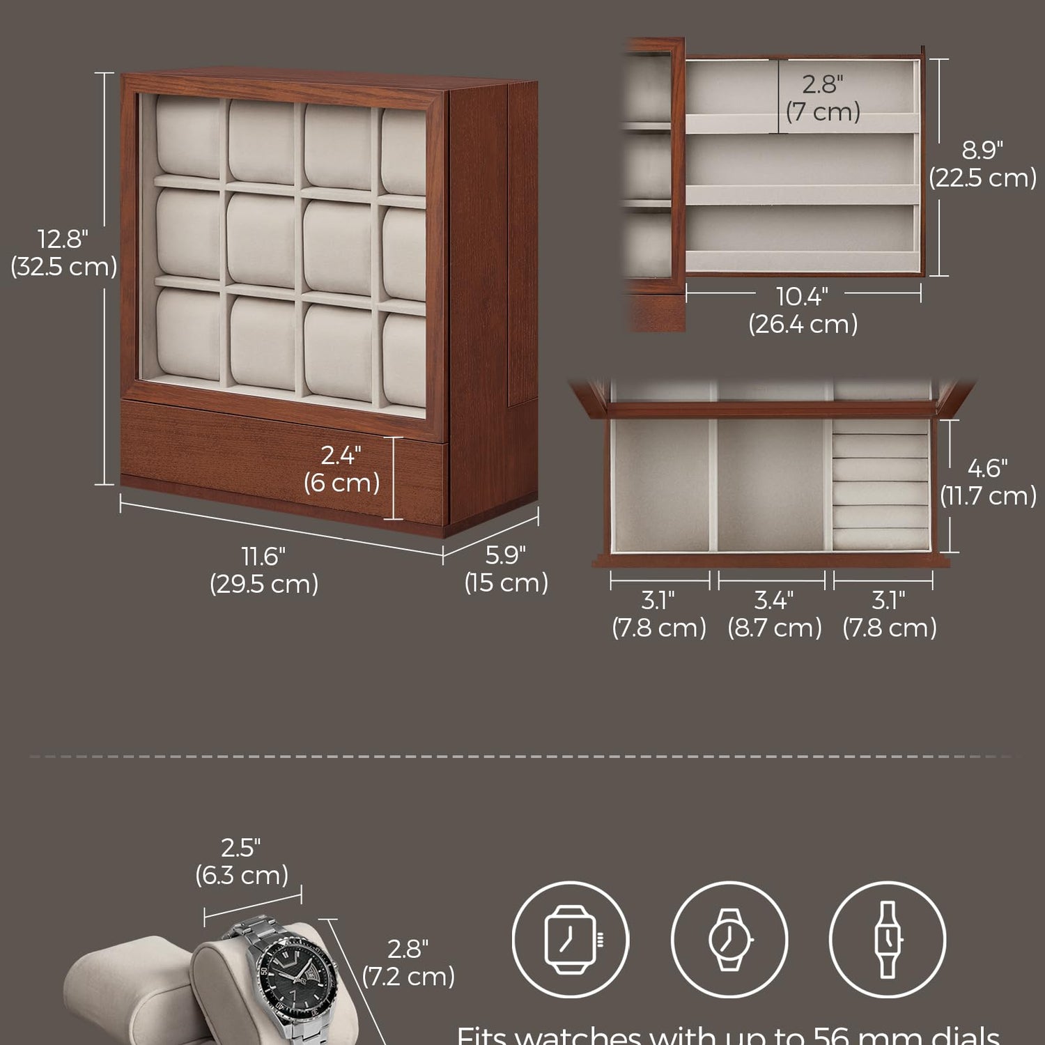 - [Chic, Compact, and Convenient] This watch box measures 5.9 x 11.6 x 12.8 inches and boasts a clear window for displaying up to 12 watches. With its vertical storage design and wood grain surface, this watch box saves tabletop space while adding style