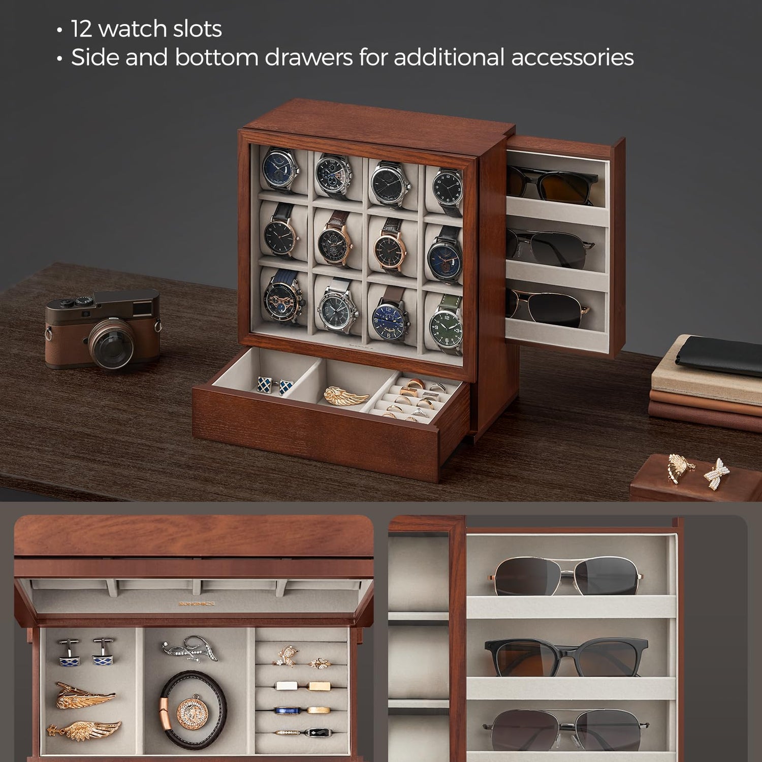 - [For More than Watches] With a hidden side drawer for sunglasses and bowties, and a convenient bottom drawer for rings and bracelets, you'll have everything you need in this versatile watch box. Simplify your daily routine!