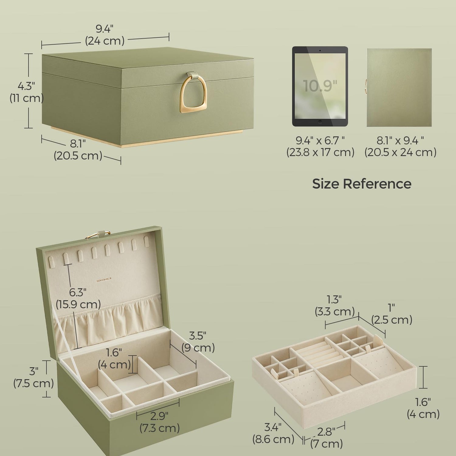 SONGMICS 2-Layer Jewelry Box, Jewelry Organizer with Handle, Removable Jewelry Tray, Jewelry Storage, Floating Effect, 8.1 x 9.4 x 4.3 Inches, Gift Idea, Laurel Green UJBC165C02