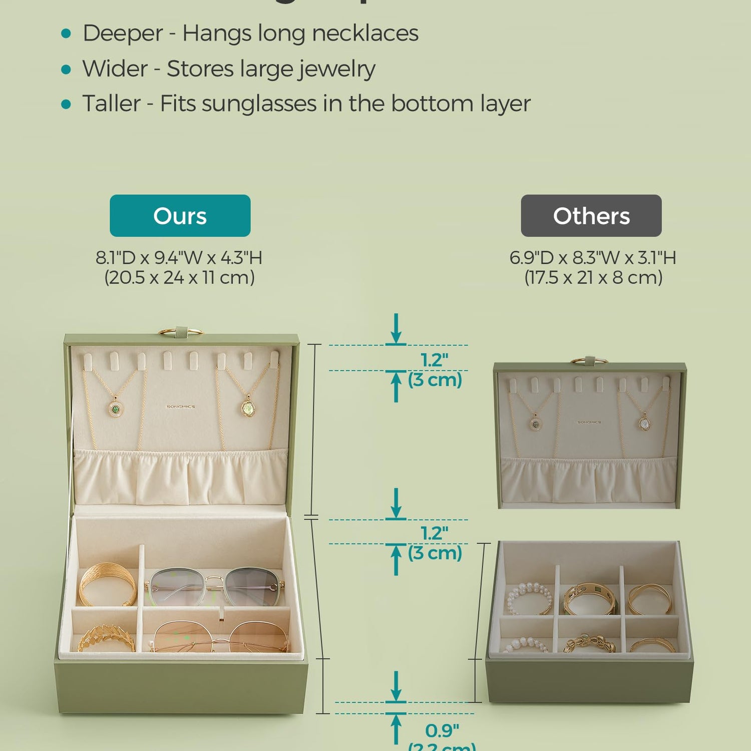 - [Abundant Dedicated Storage] This spacious jewelry box helps to organize all your treasured accessories—hooks on the lid for long necklaces, the bottom layer for sunglasses, and multiple sections for earrings, studs, rings, watches, and bracelets