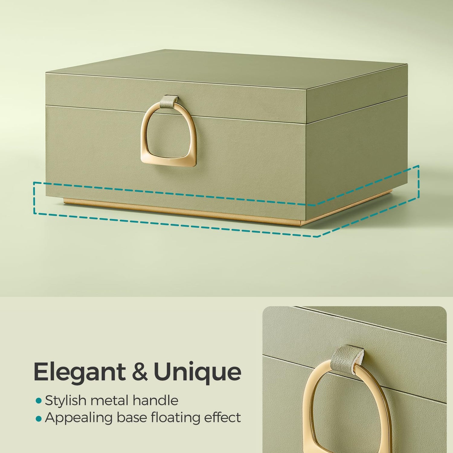 - [Stylish & Original Design] This eye-catching jewelry box boasts an elegant blend of green and gold, a unique metal handle for effortless opening and closing, and a remarkable base that creates a captivating floating effect