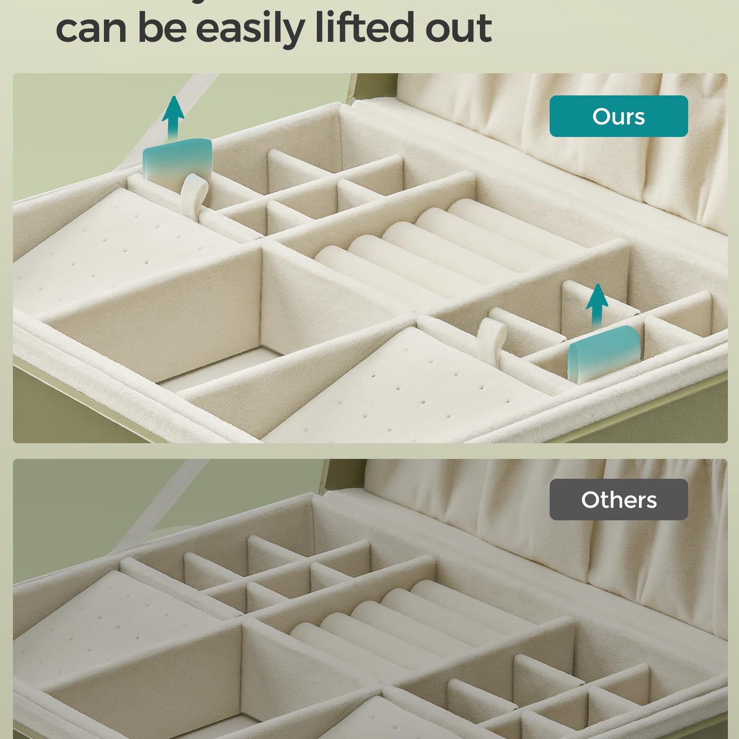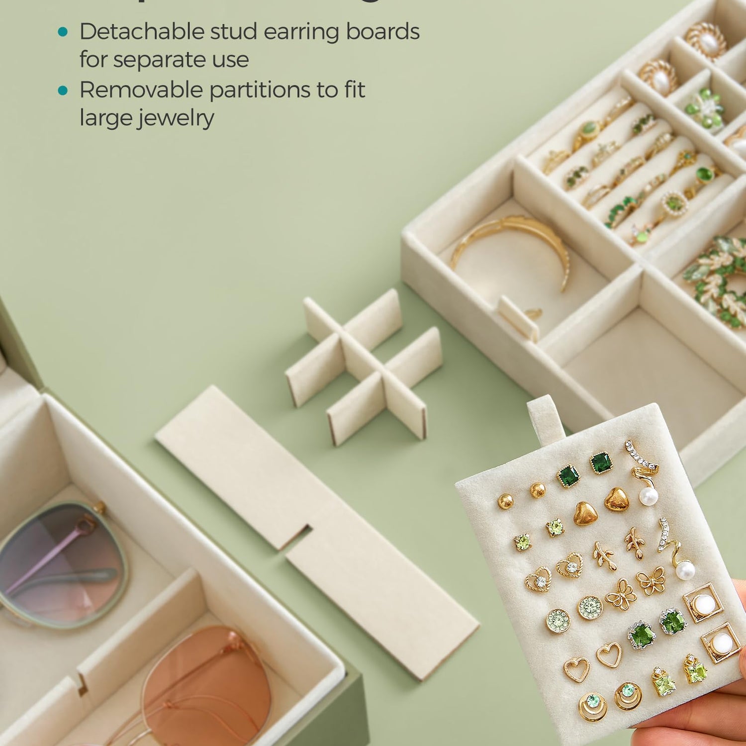 - [Convenient Features] The stud earring boards can be positioned in the top tray, lower section, or outside the box to provide adaptable storage. Detachable partitions create space for larger items, while side handles allow easy lifting of the top tray
