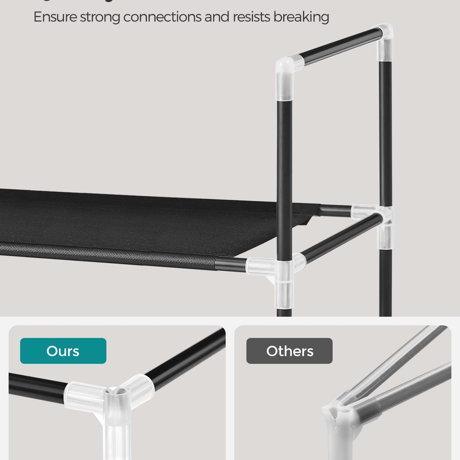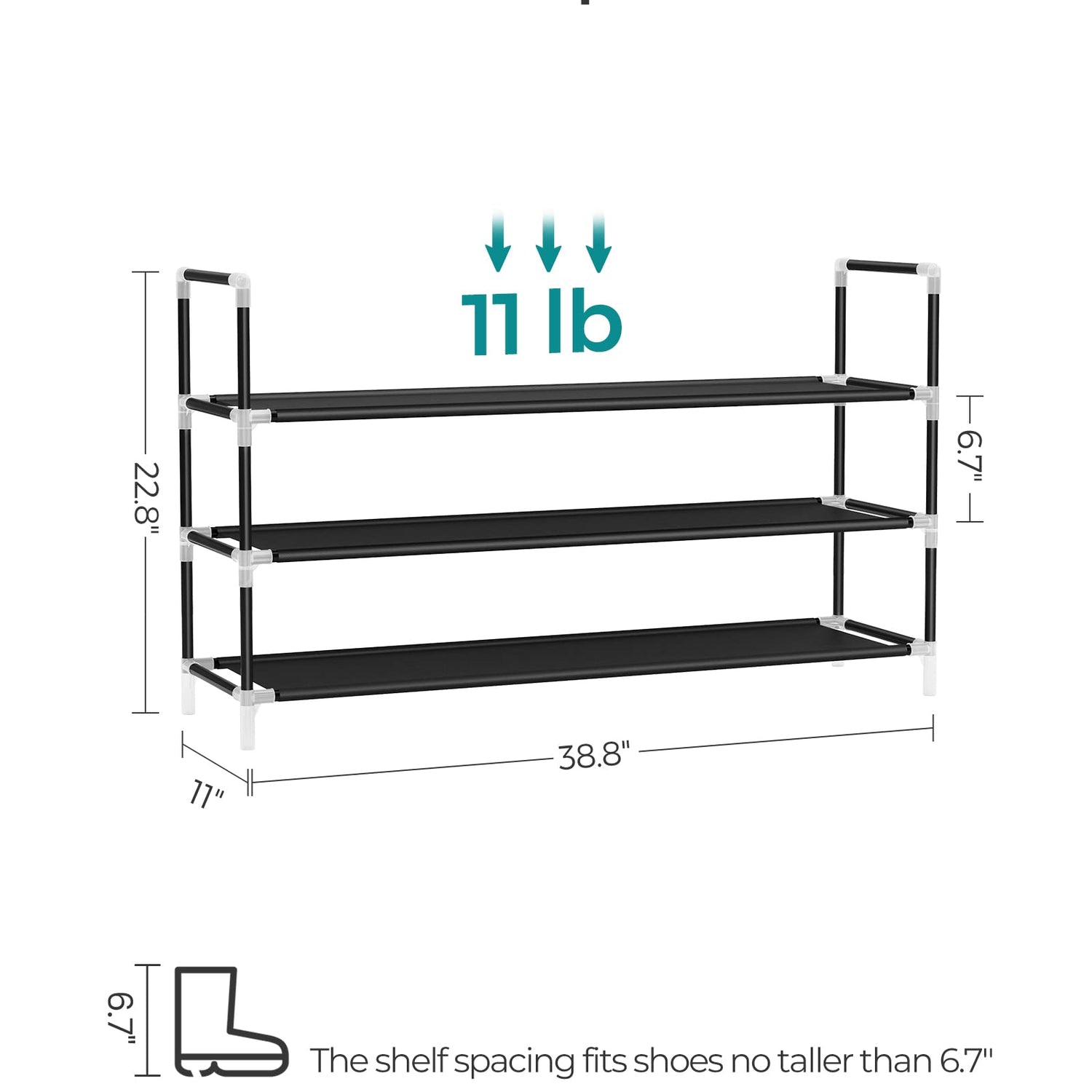 - [Lightweight yet Strong] Constructed with non-woven fabric shelves, metal tube frames, and sturdy plastic connectors, this shoe rack is lightweight yet strong to hold up to 11 lb per tier