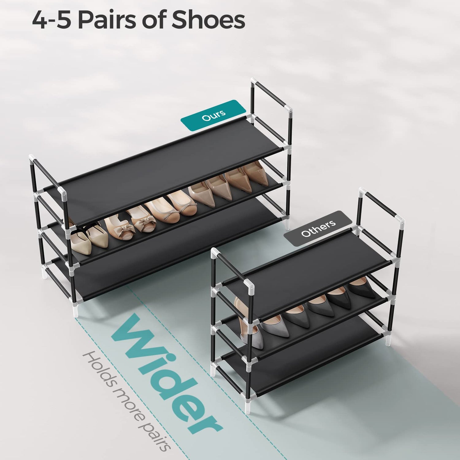 - [Space for Every Pair] With a length of 38.8'', 4-5 pairs of shoes can comfortably sit on each shelf, totaling to 12-15 pairs. The 6.7'' spacing between the shelves allows you to store any type of footwear, from sneakers to high heels