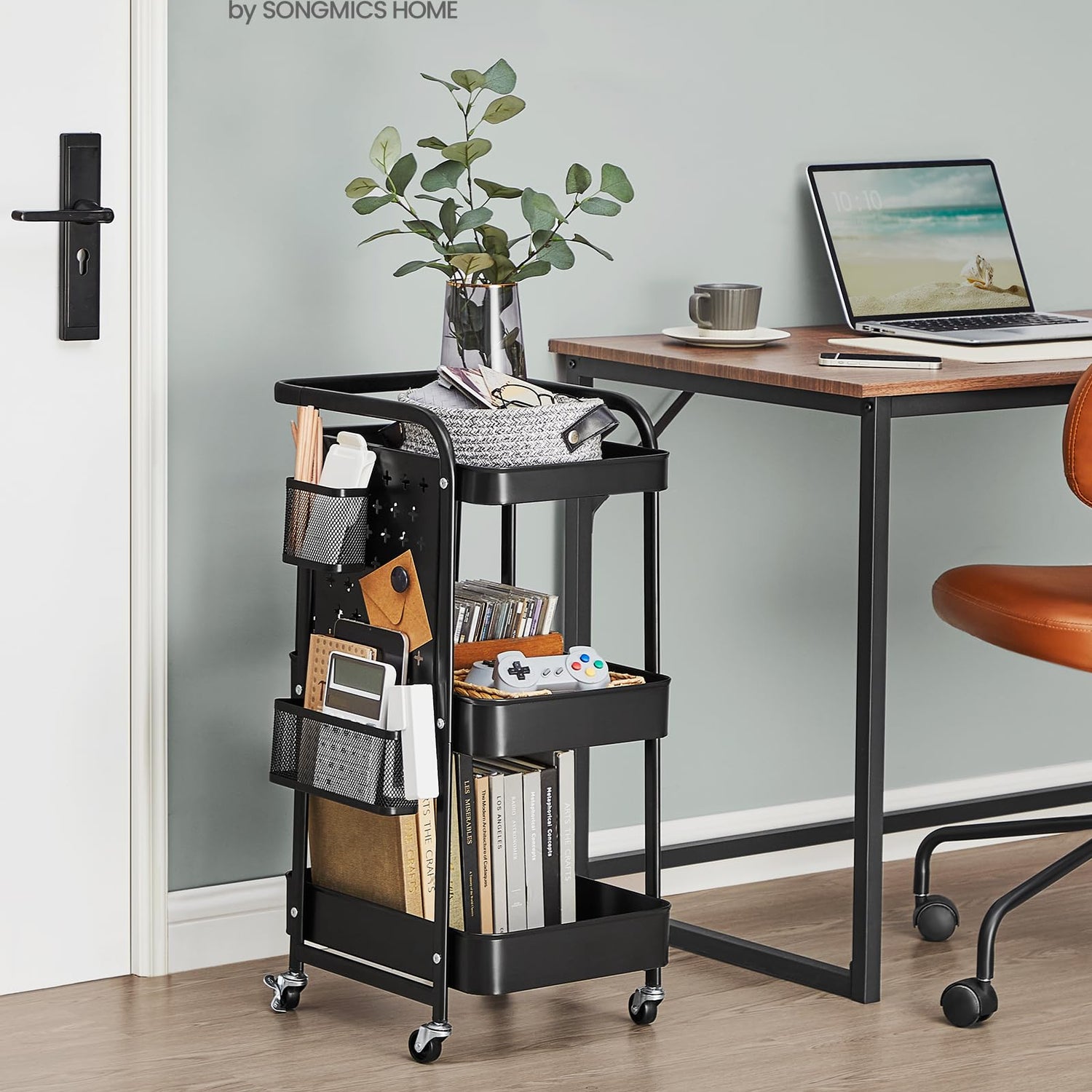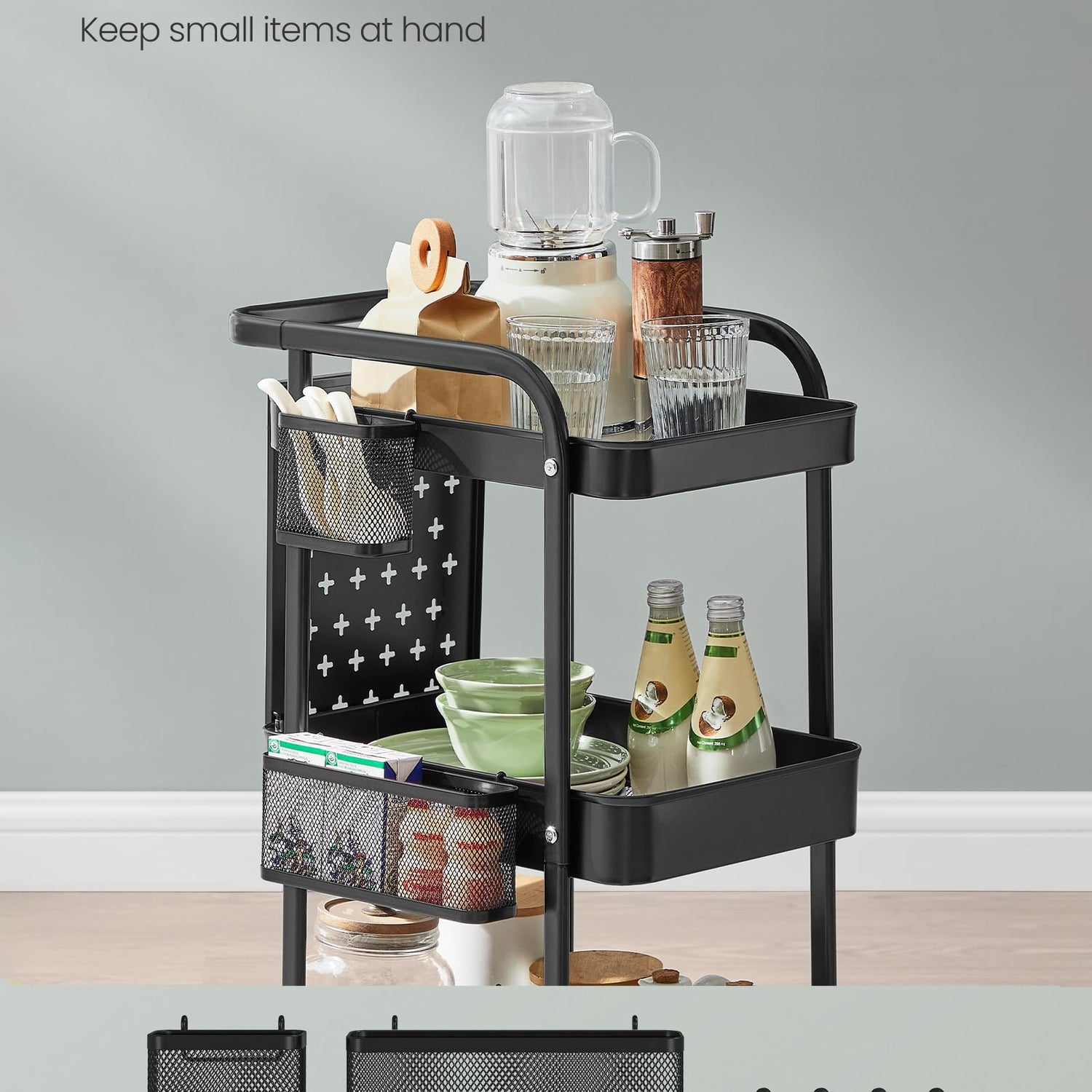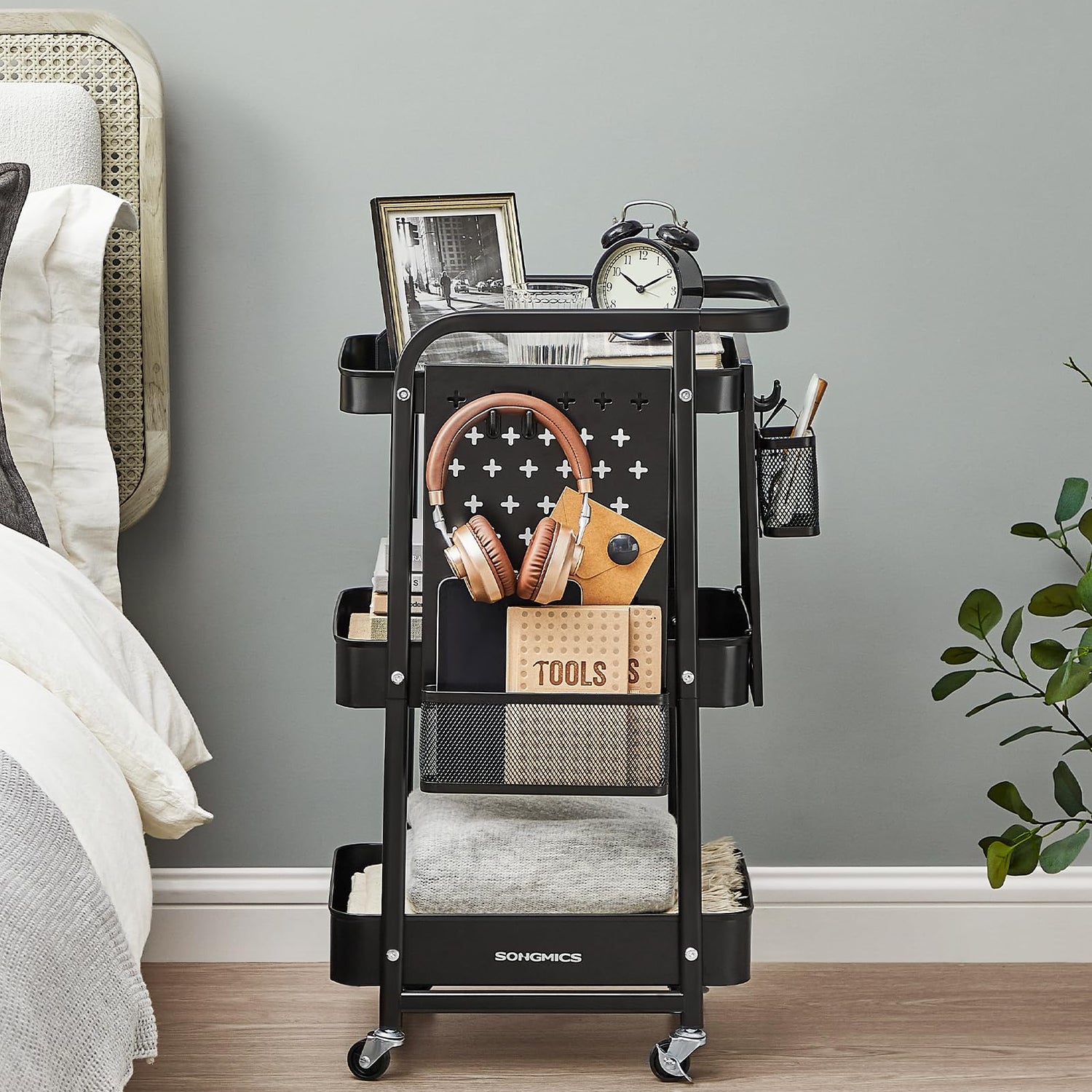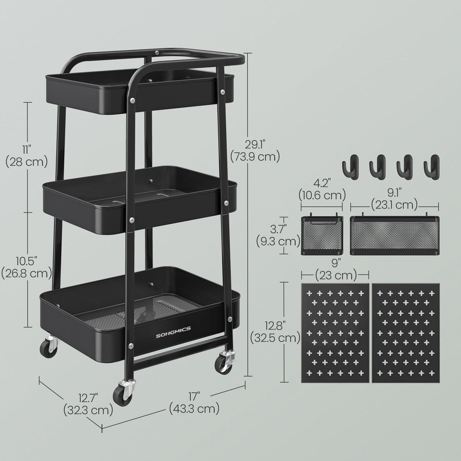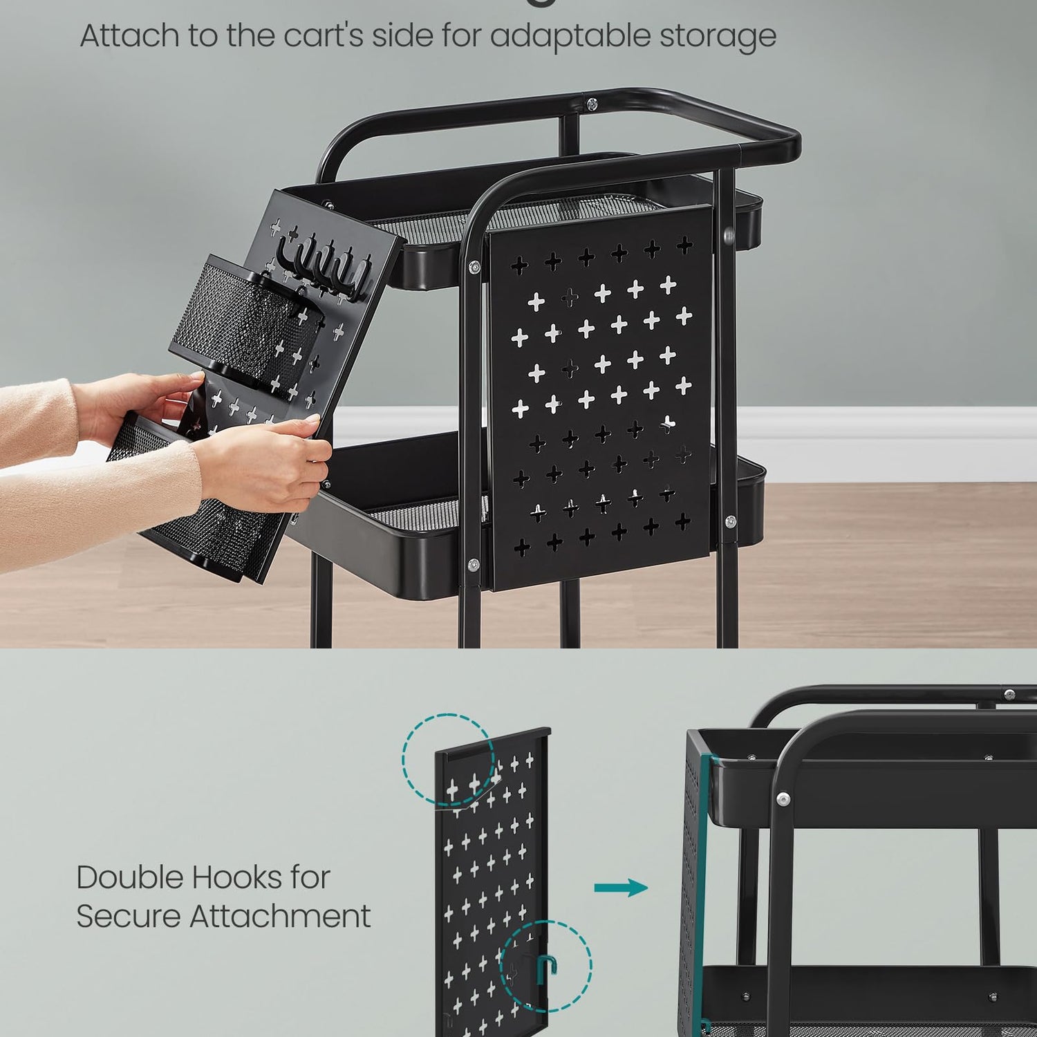 SONGMICS 3-Tier Storage Cart, Rolling Utility Cart, Metal Mesh Shelves, 2 Removable Pegboards, 2 Hanging Holders, 4 Hooks, Craft Cart for Living Room, Kitchen, Office, Bathroom, Ink Black ULRC037B01