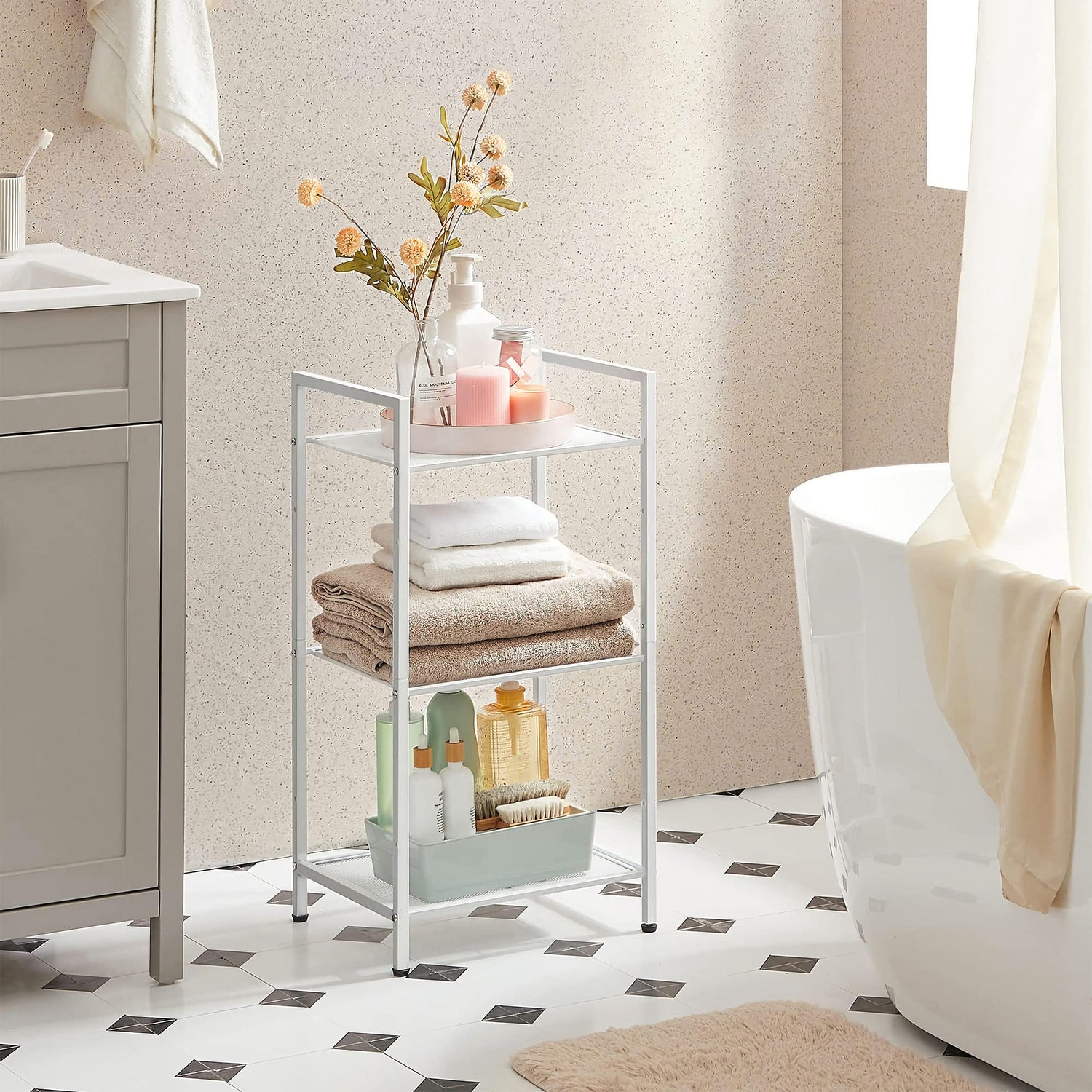 SONGMICS 3-Tier Storage Rack, Bathroom Shelf, Extendable Plant Stand with Adjustable Shelf, for Bathroom, Living Room, Balcony, Kitchen, White UBSC033W01, 11.8 x 15 x 28.4 Inches