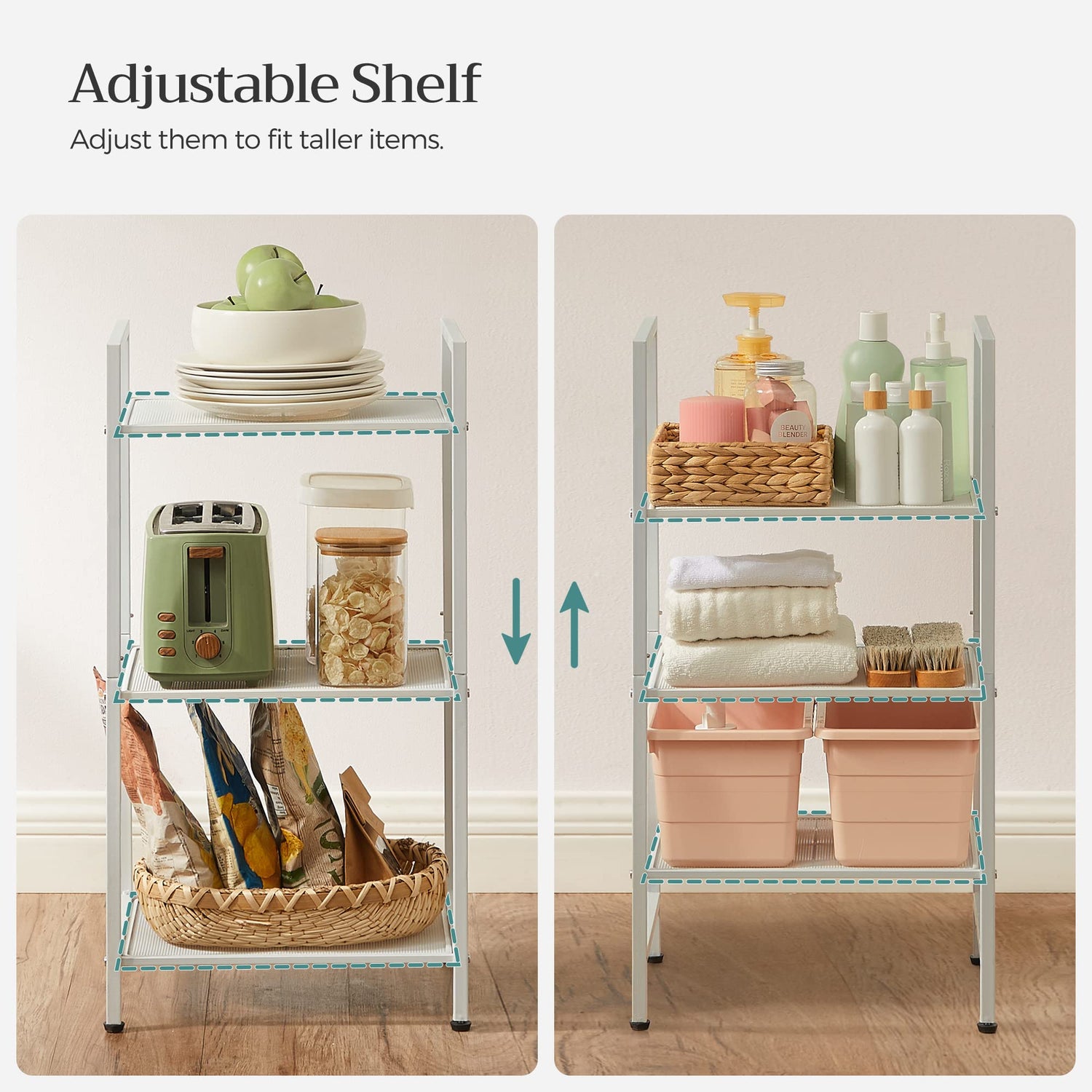 - [High-Quality, Our Way] The strong metal frame used in this storage rack means extra strength and durability, ensuring a static load up to 22 lb per shelf. From your towels to your numbers of cleaning supplies, they’ll sing songs of praise to this silent hero