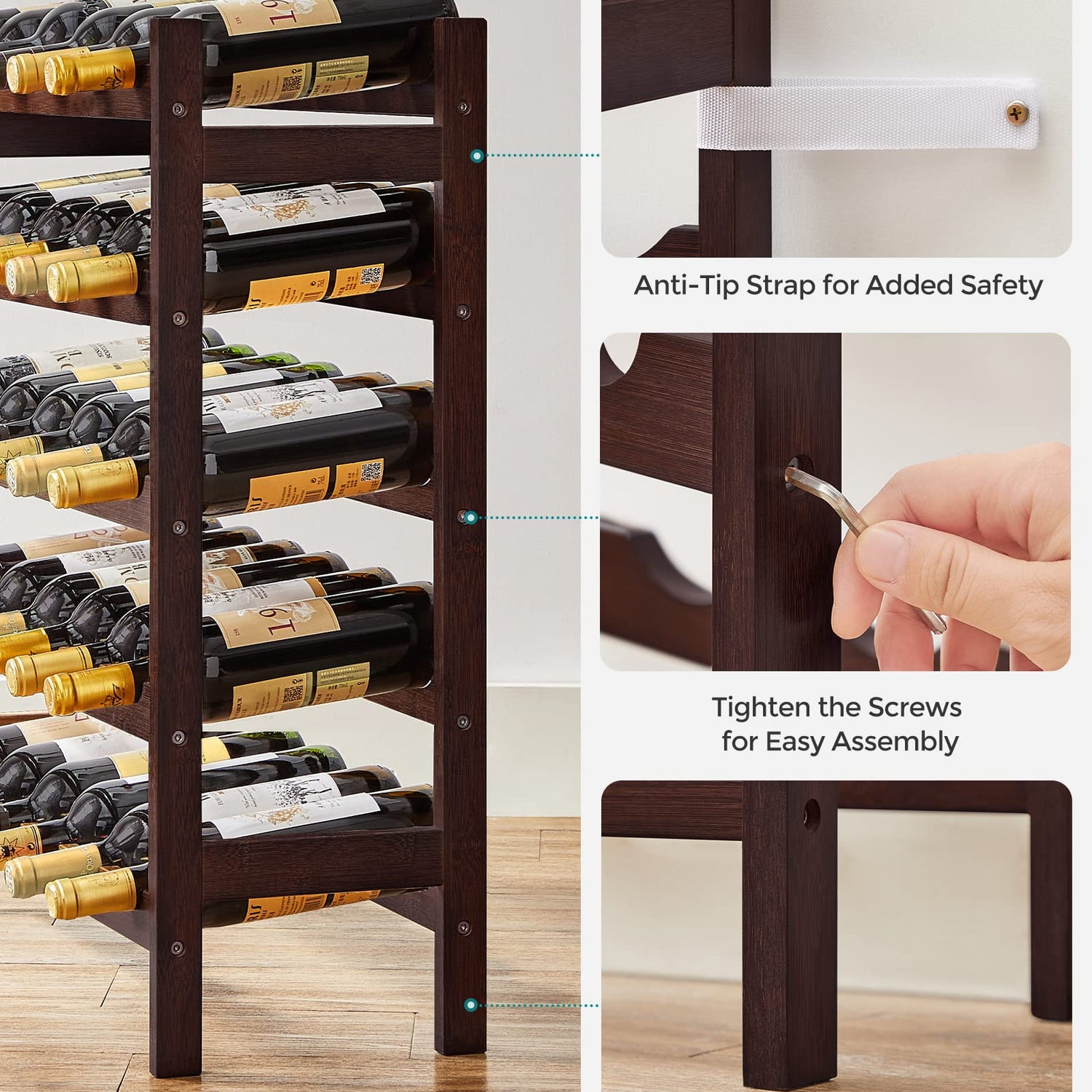 - 【WHAT YOU GET】A 5-tier bamboo wine rack sized 9.6" x 24.9" x 28.7", an anti-tip strap to keep your wine safe, 4 protective pads on the bottom of the legs to protect your floor, and clear instructions for easy assembly