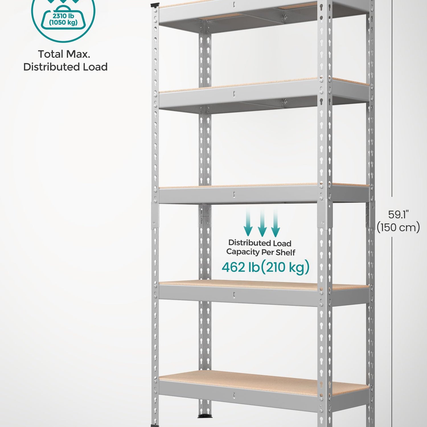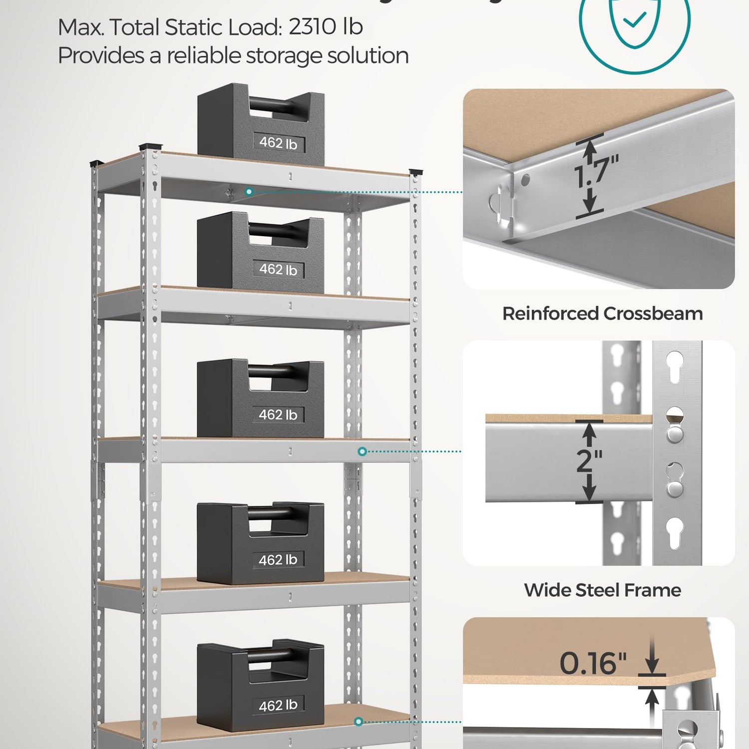 - [Stable and High Load Capacity] The sturdy steel frame and thick MDF panels of this 5-tier shelving unit offer a maximum weight capacity of 462 lb per shelf, while reinforced crossbeams provide extra stability