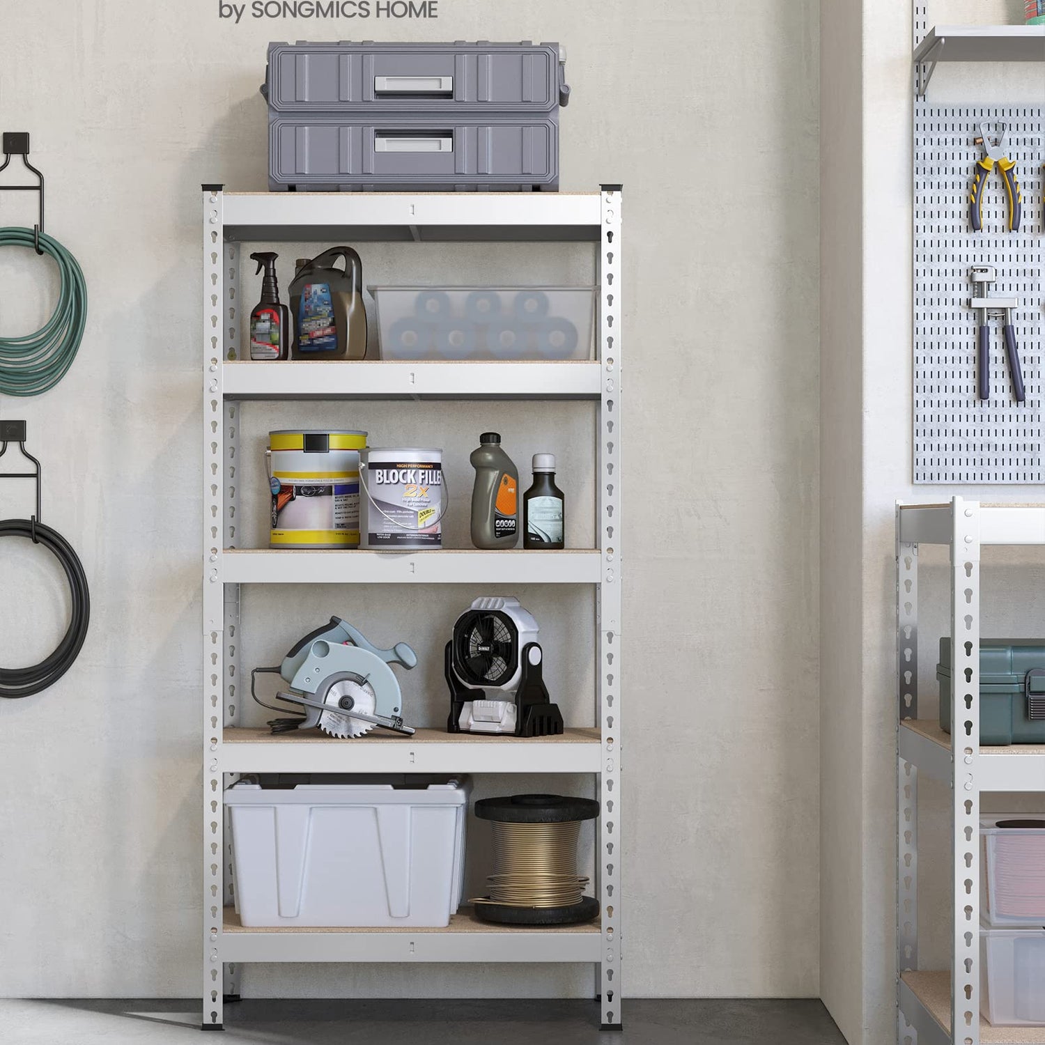 - [Thoughtful Design] This heavy-duty shelving unit comes with foot pads to reduce noise during movement and protect the floor from scratches. The included anti-tip kit allows you to firmly attach the garage shelf to the wall, ensuring stability and safety