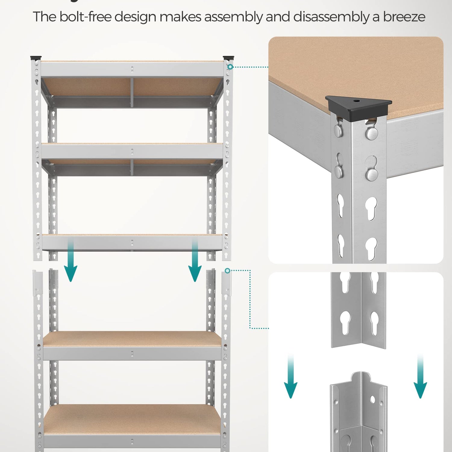 - [Boltless Assembly] With no bolts required, assembling this garage shelving is effortless, allowing you to get your items off the floor and onto the shelves in no time. Also, the bolt-free design makes it easier to disassemble and move when necessary