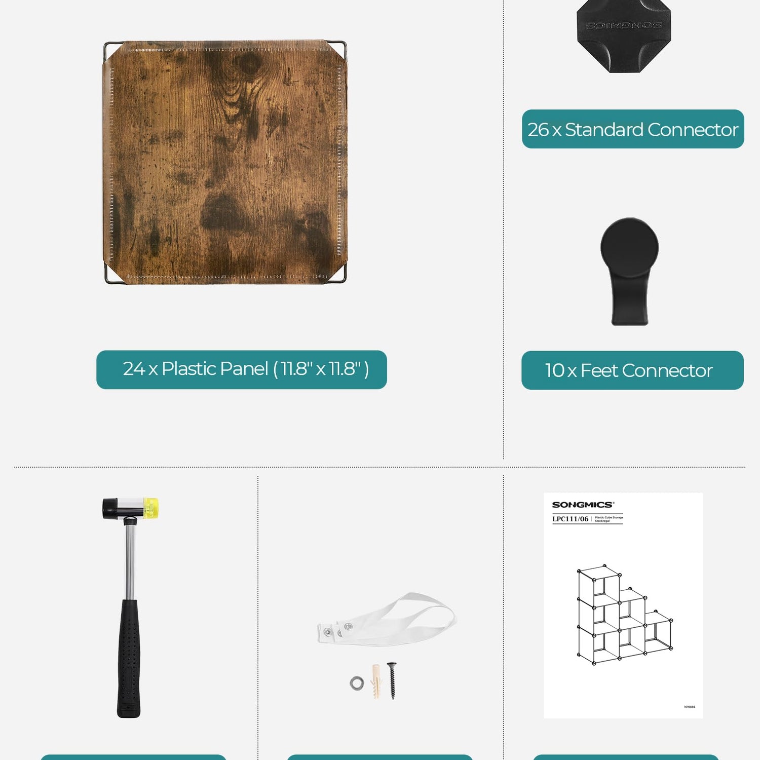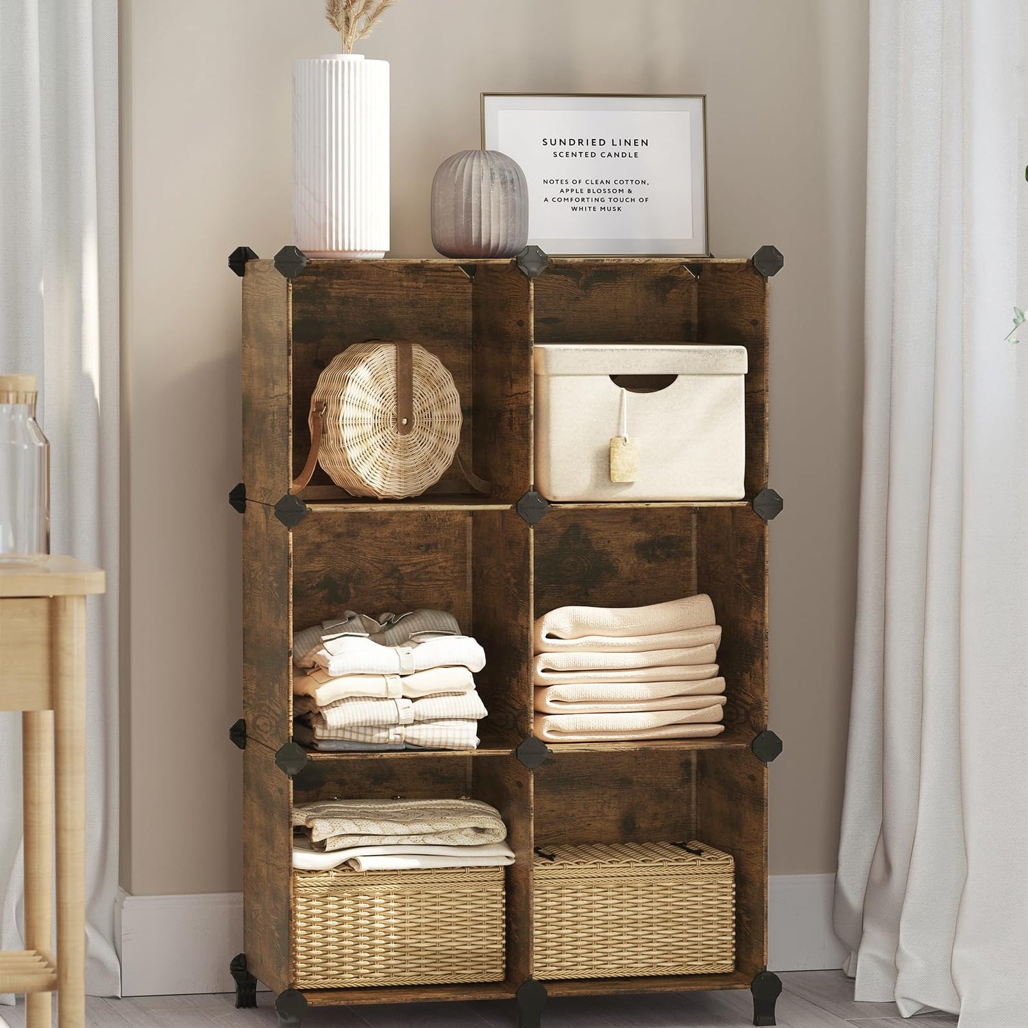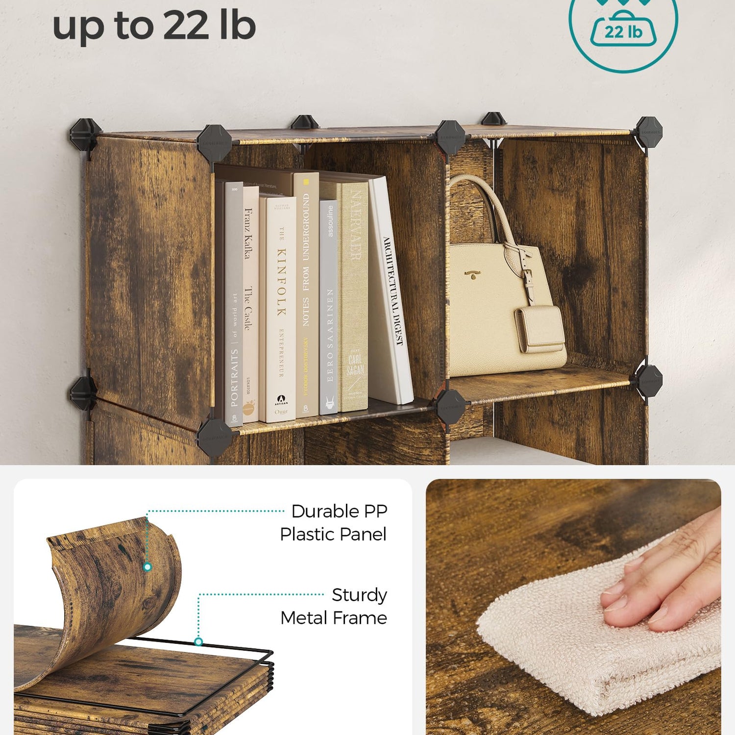 SONGMICS 6 Cube Storage Organizer, DIY Closet Shelf, Plastic Clothes Organizer, Modular Bookcase, 11.8 x 11.8 x 11.8 Inch Cubes, with Feet and Rubber Mallet, Rustic Brown ULPC111A01