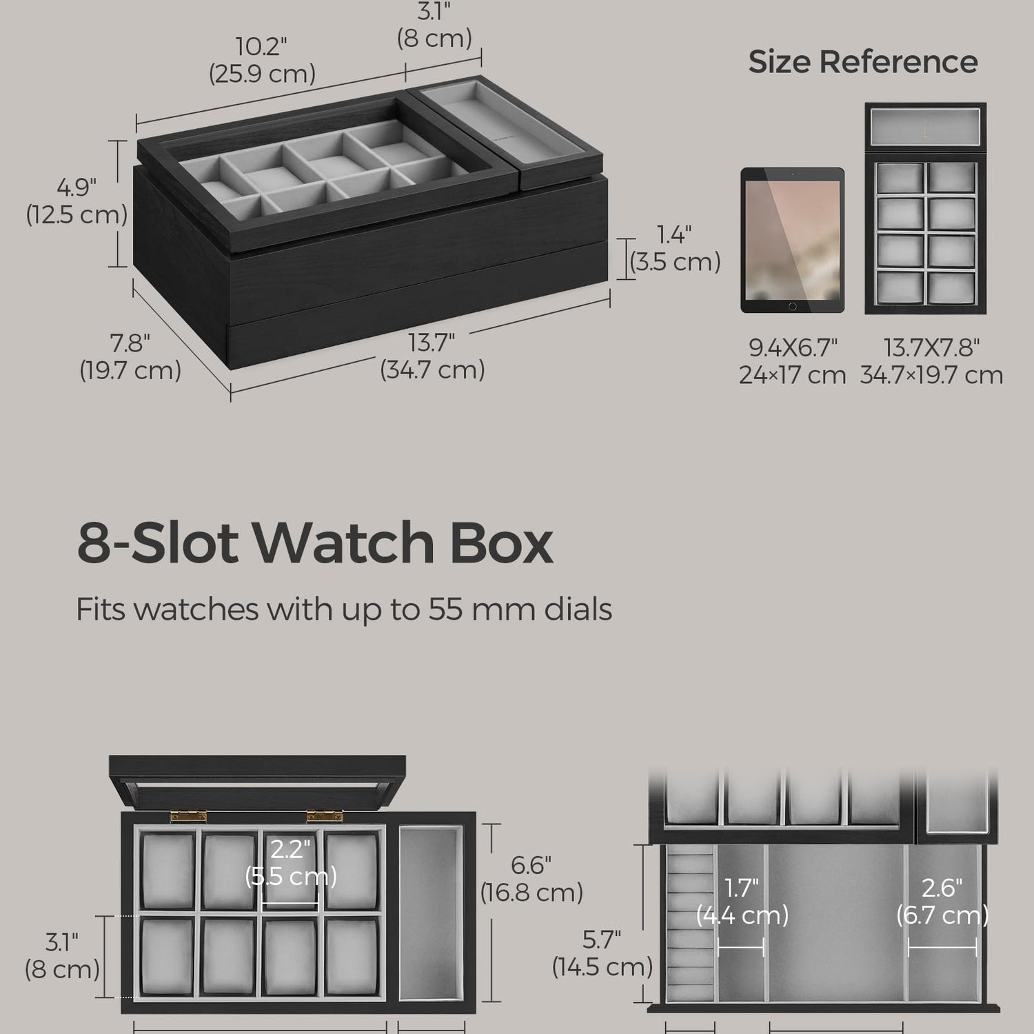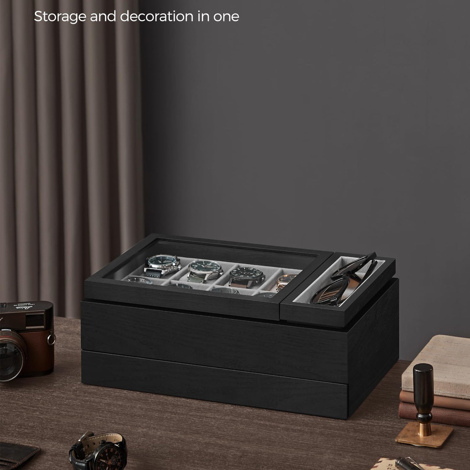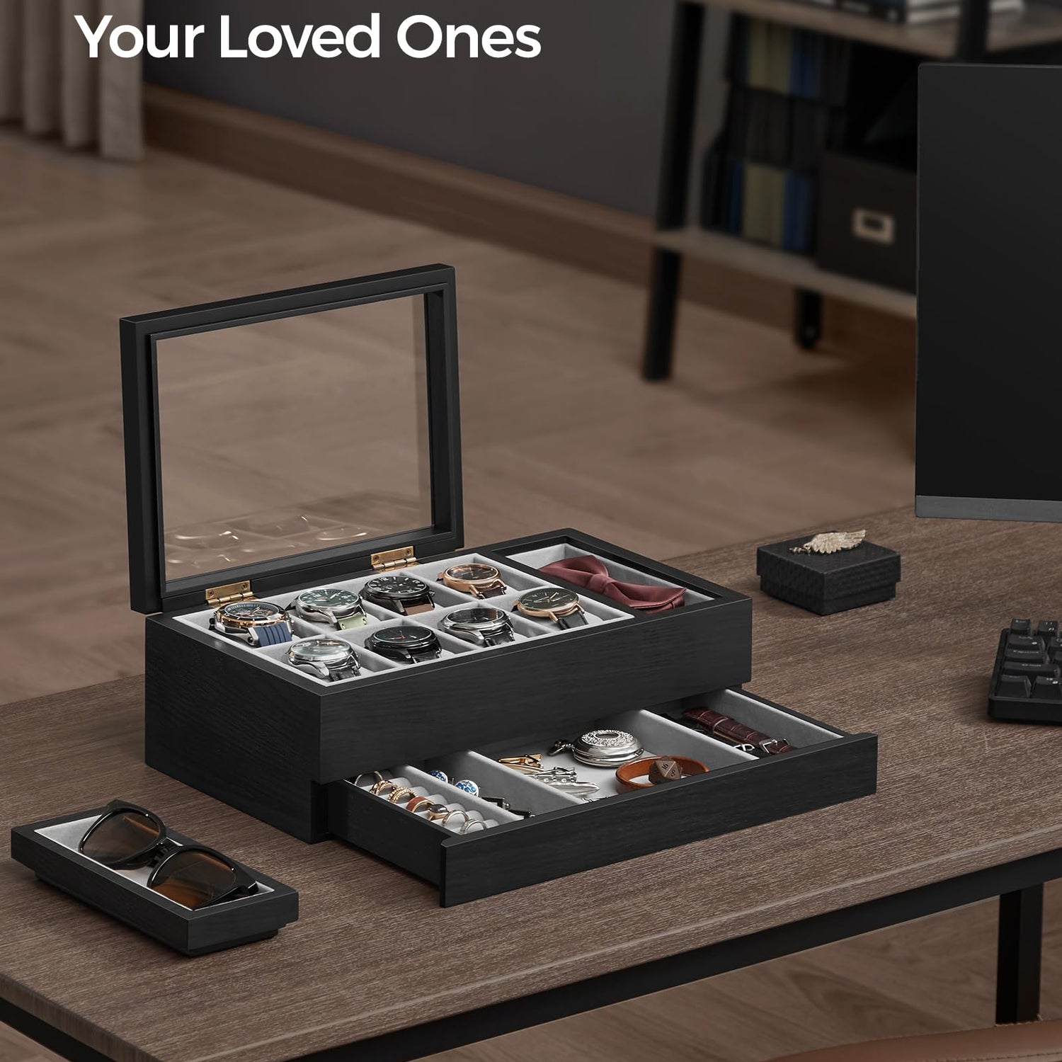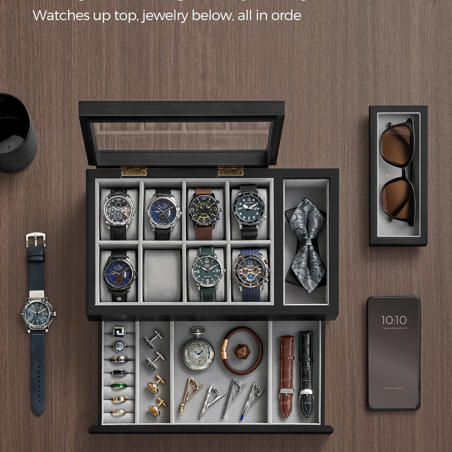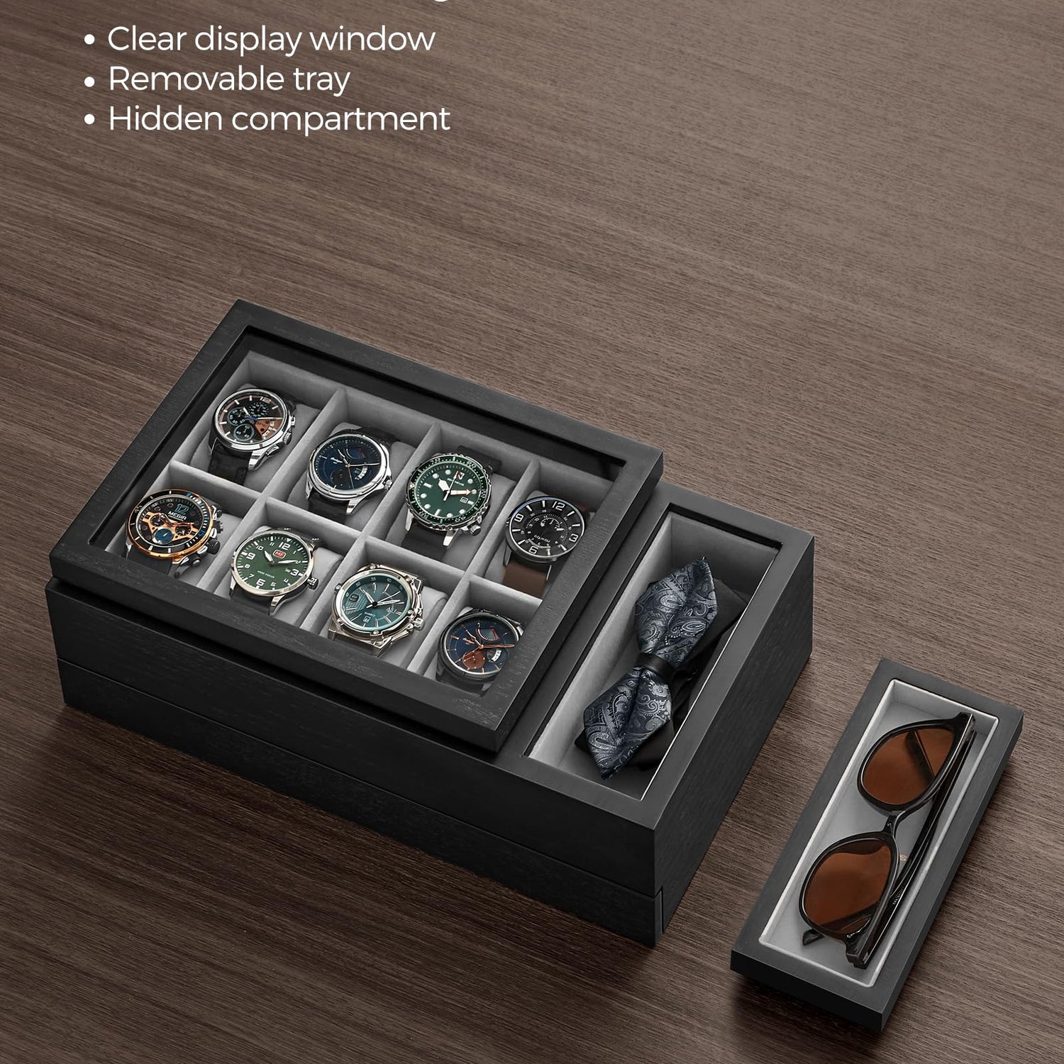 - [Convenient Top Layer] The left side of the top layer offers 8 watch slots with a transparent lid so you can admire their aesthetics. On the right side, you'll find a removable tray for easy access to your favorite jewelry and a hidden compartment for more