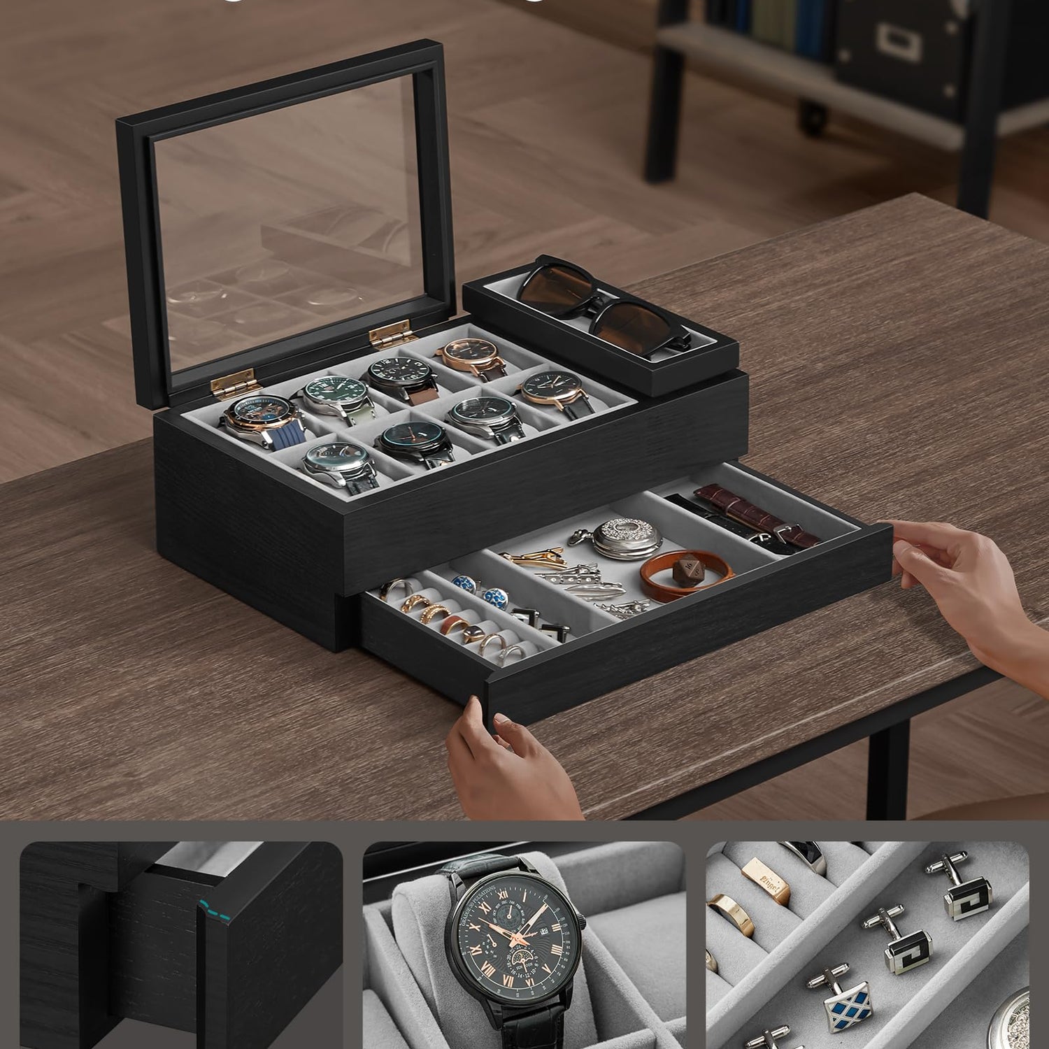 - [Bottom Divided Drawer] The bottom drawer of this watch case provides ample storage space for your accessories. It features 8 ring slots and 3 compartments for your watchbands and cufflinks