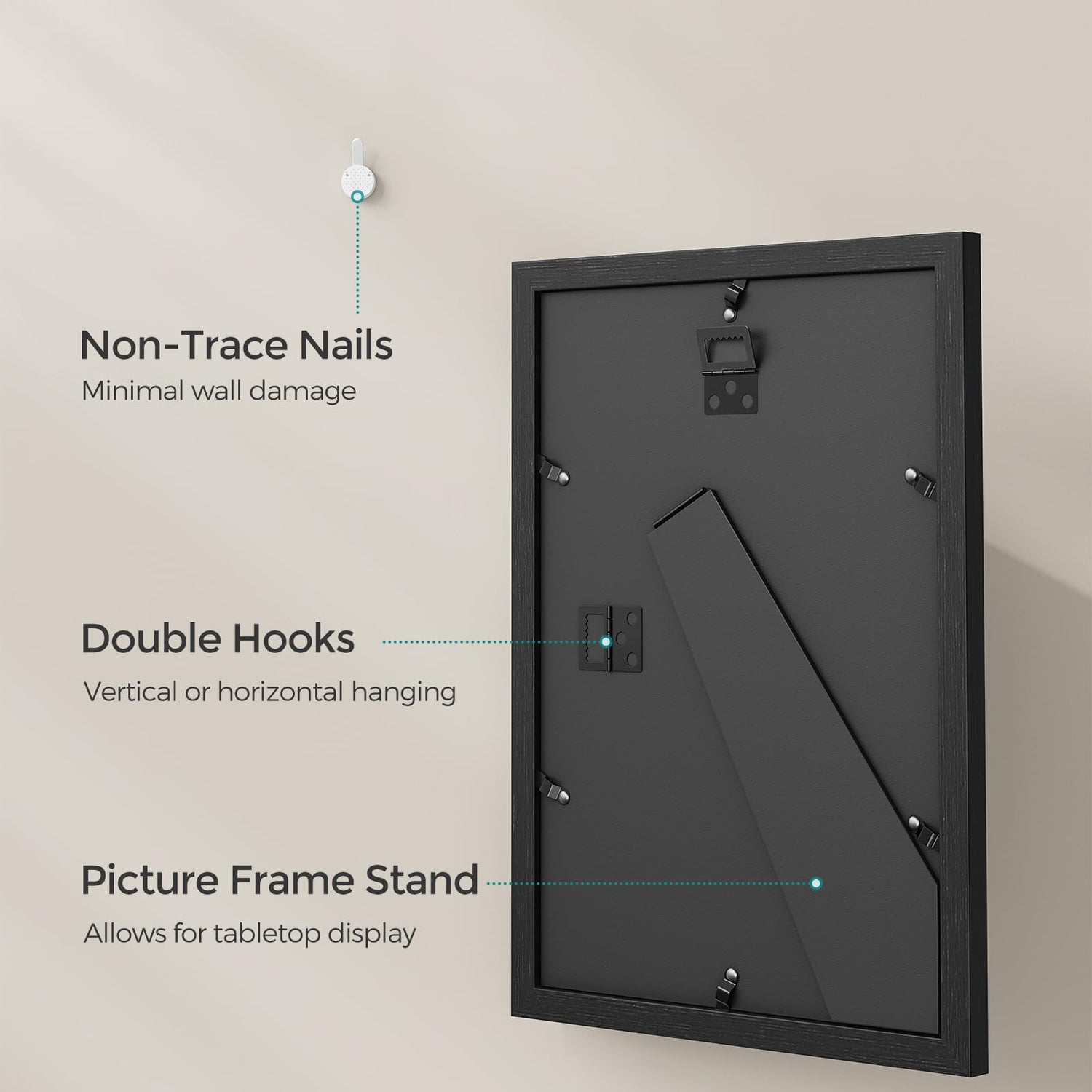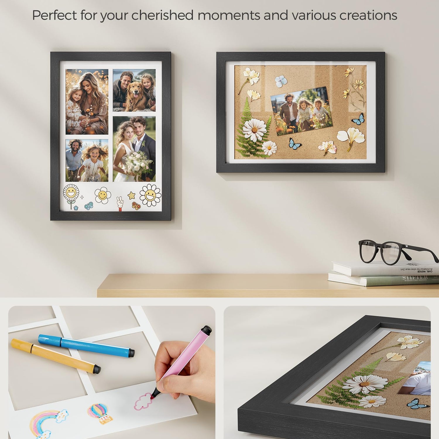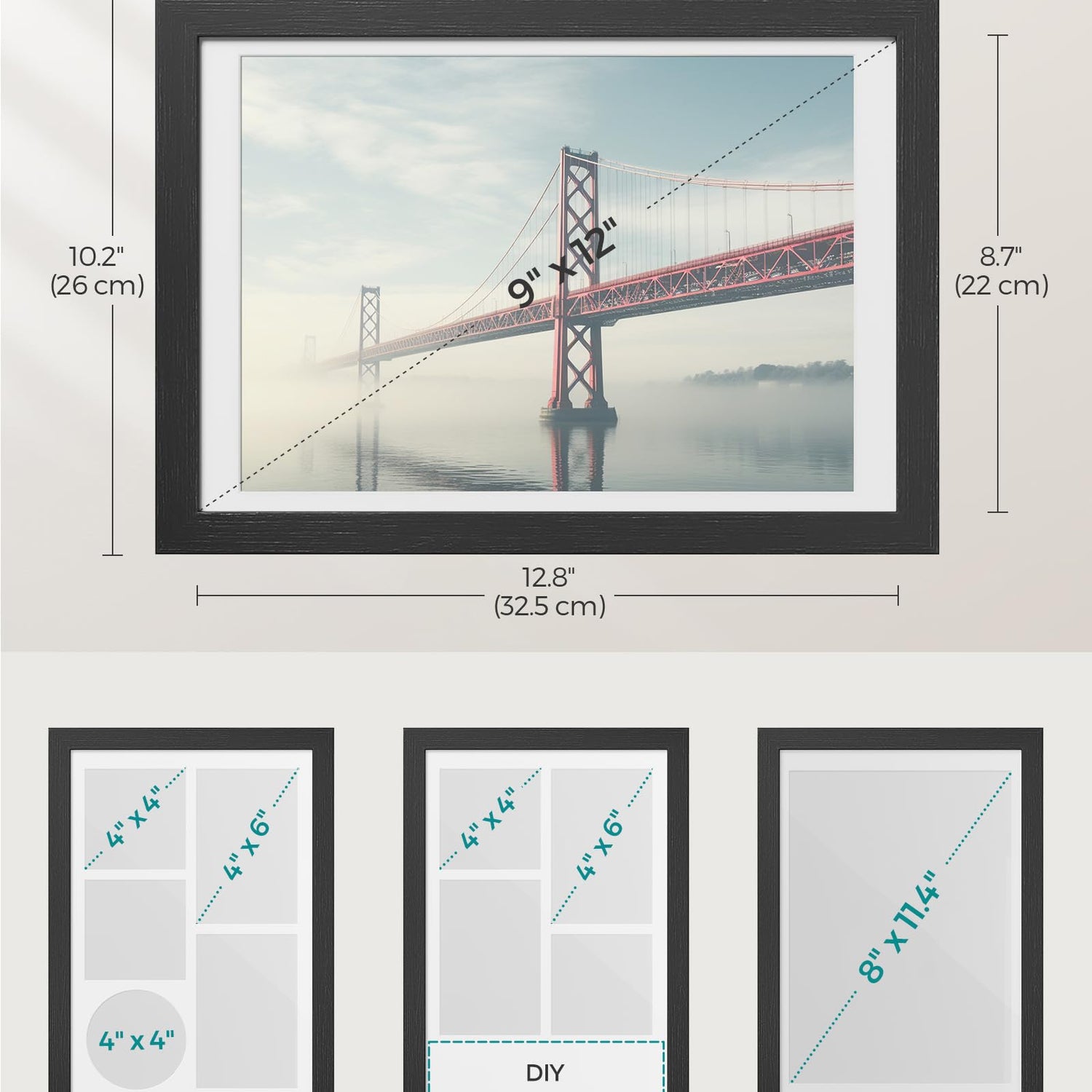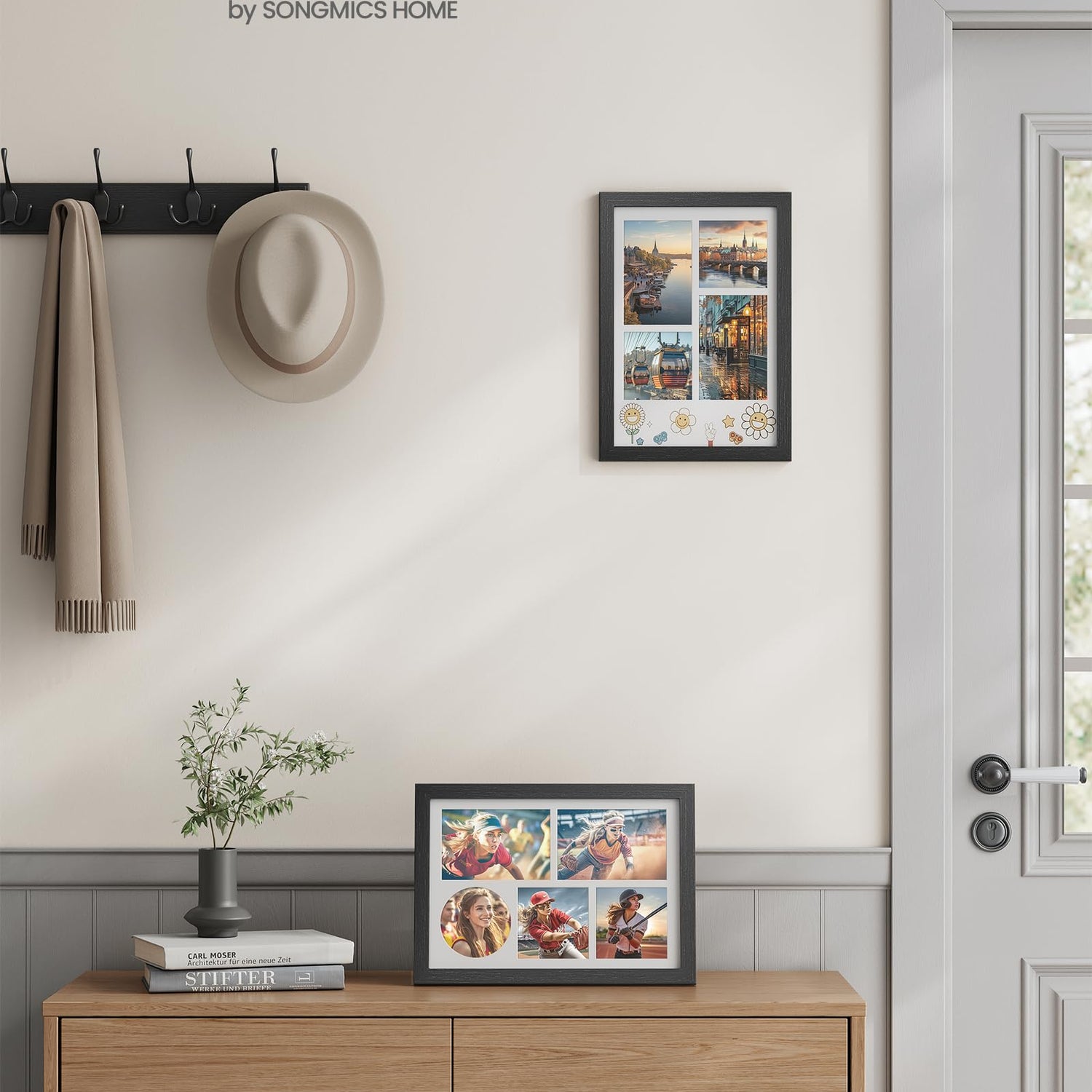 SONGMICS A4 Picture Frame Collage for Wall Decor, Set of 2, 4x6 Multi Photo Frame for Desk, 8x10, 8x12 or 4x4 Photos with 6 Mats, 9x12 Without Mat, Glass Front, 3 Non-Trace Nails, Ash Black