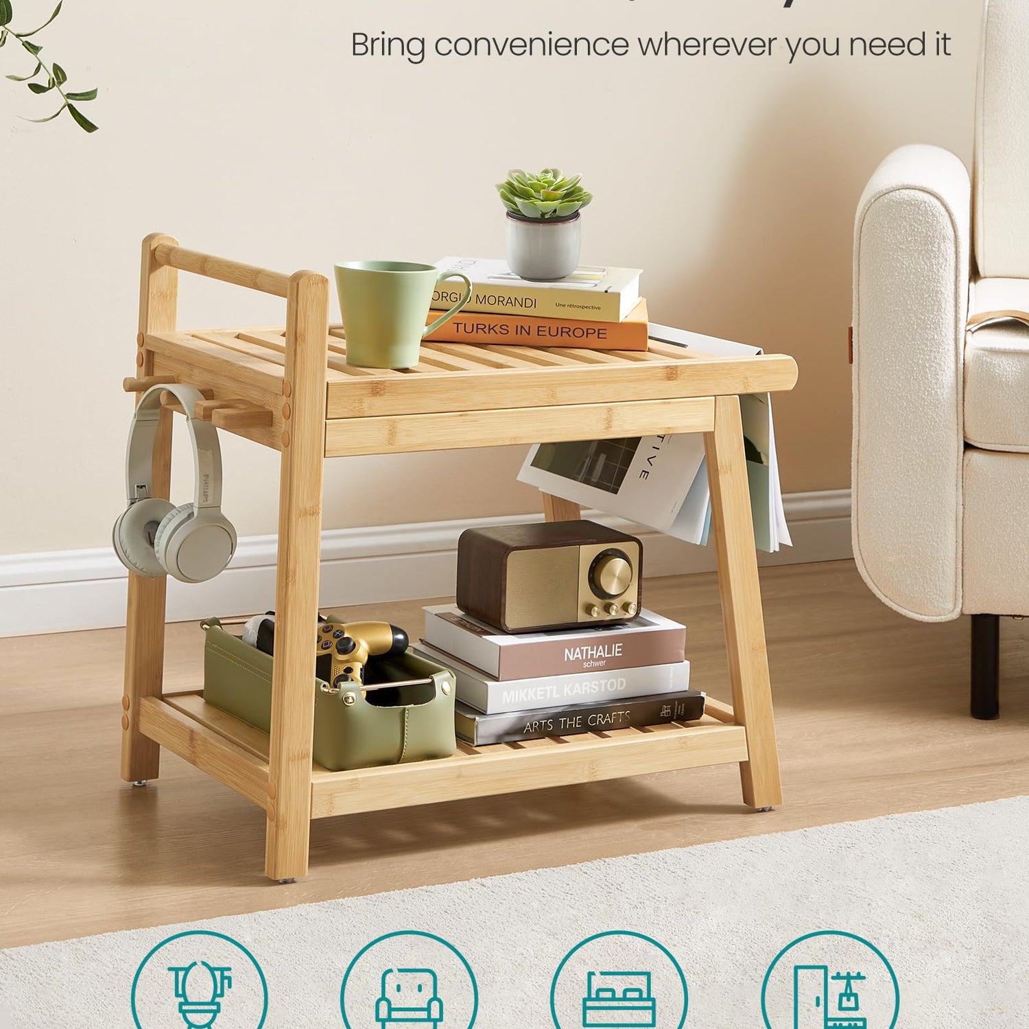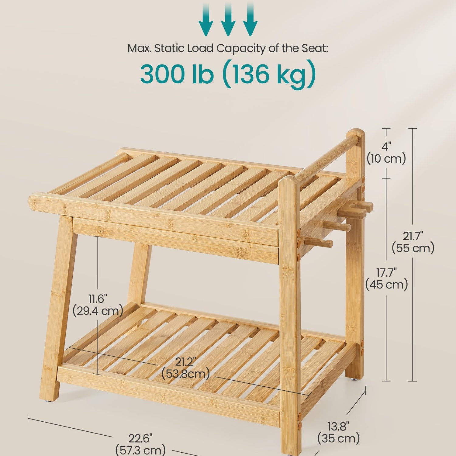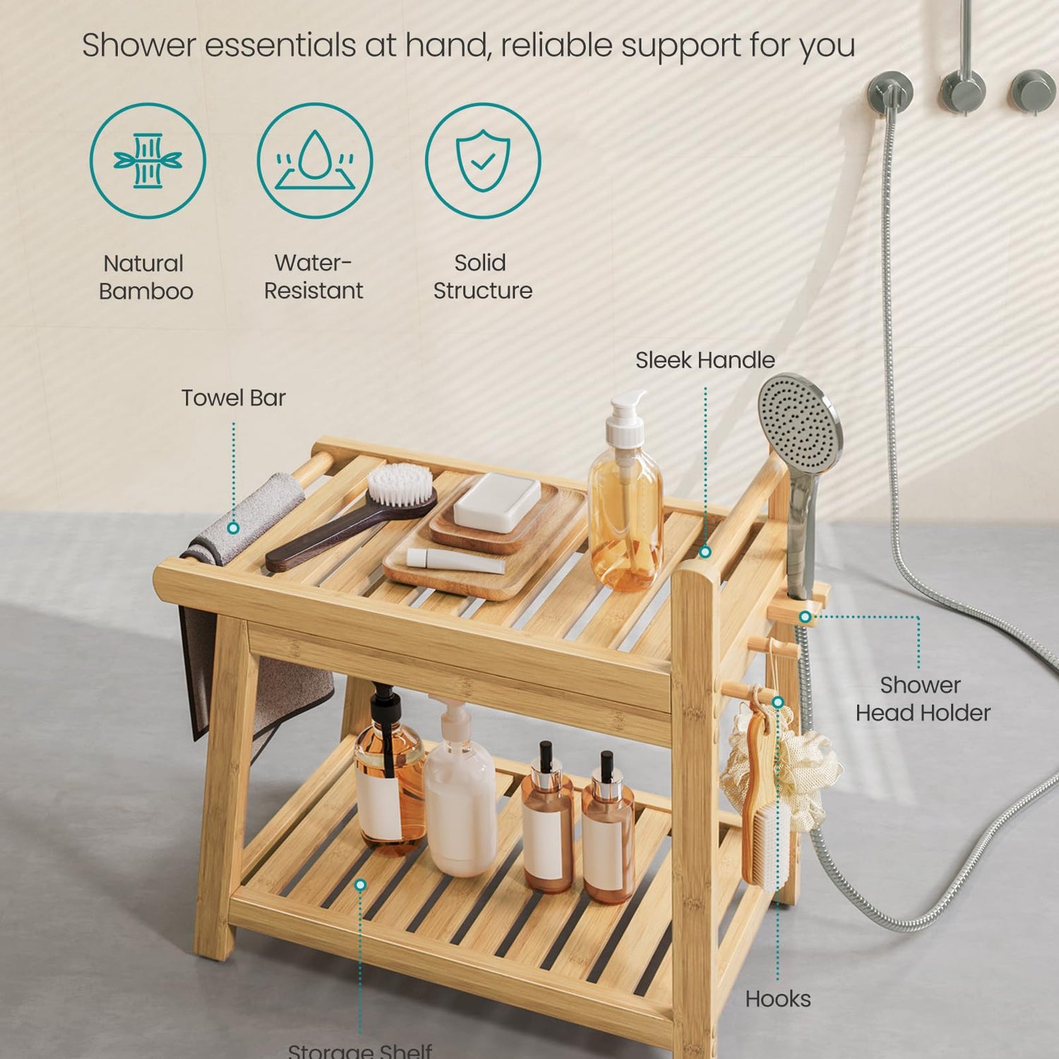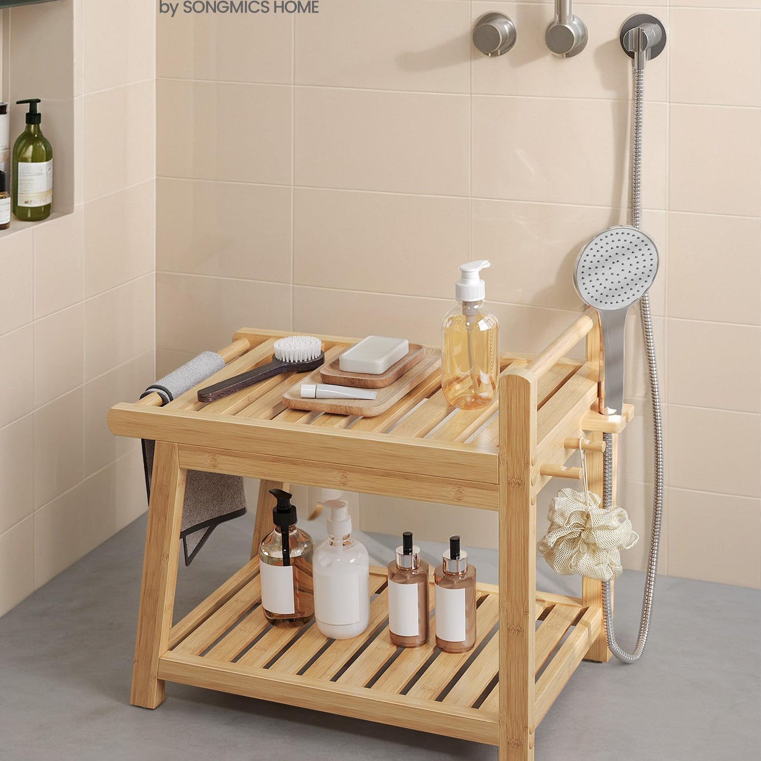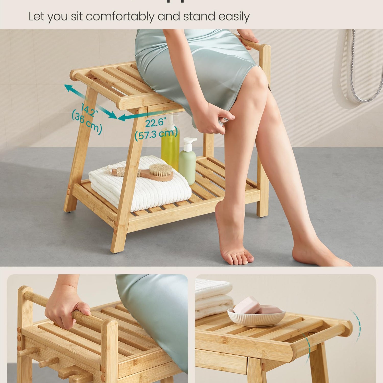 SONGMICS Bamboo Shower Bench with Storage Shelf, Shower Chair, Water Resistant Shower Stool with Handle and Hooks, Shower Head Holder, Non-Slip Feet, for Bathroom, Adults, Natural Beige UBCB121N01