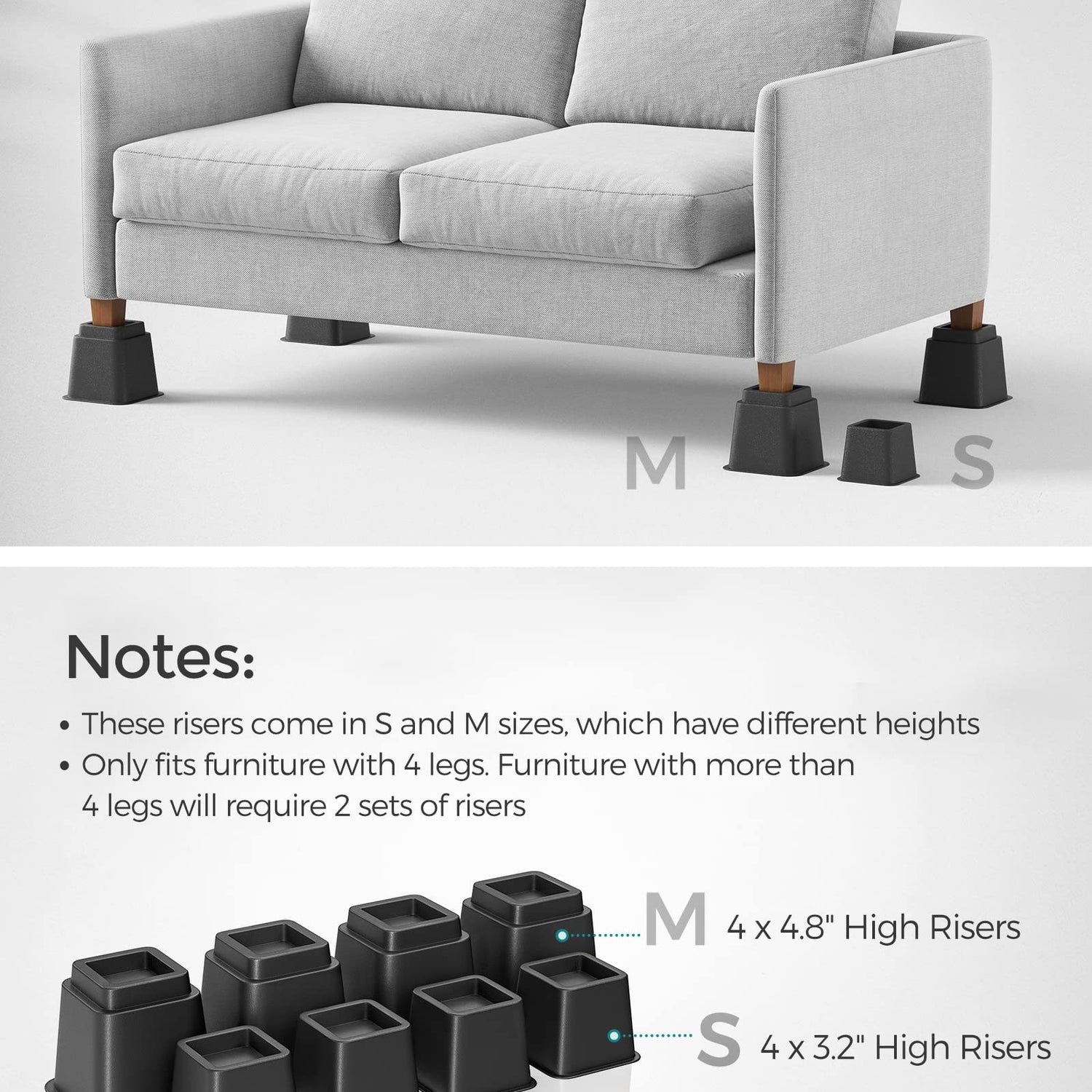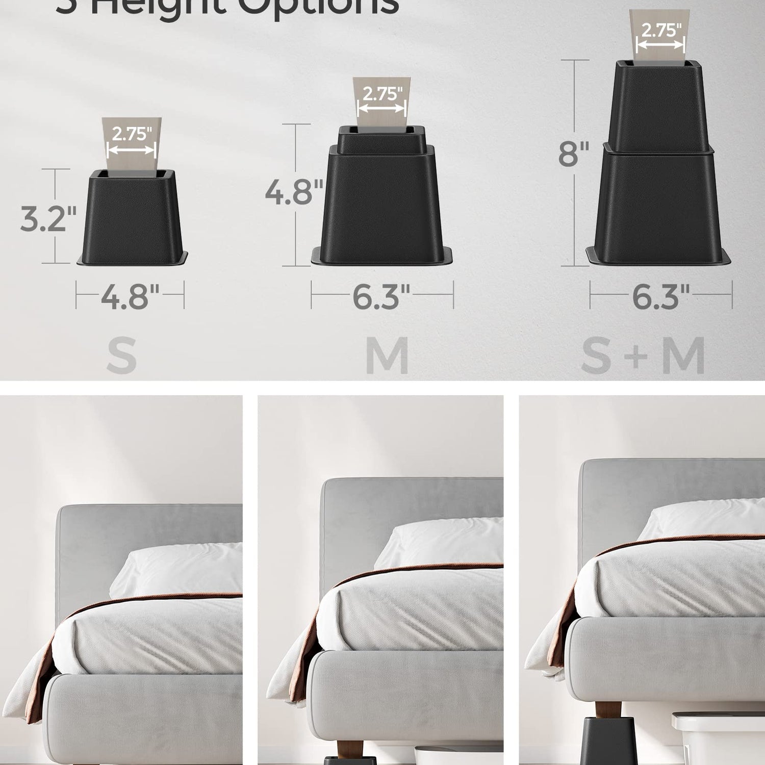 - [Set of 4 Risers] This set of 4 furniture risers is designed to only fit furniture with 4 legs. They can lift your bed to 3 height options: 3”, 5”, or 8” (when combined) for a new level of comfort