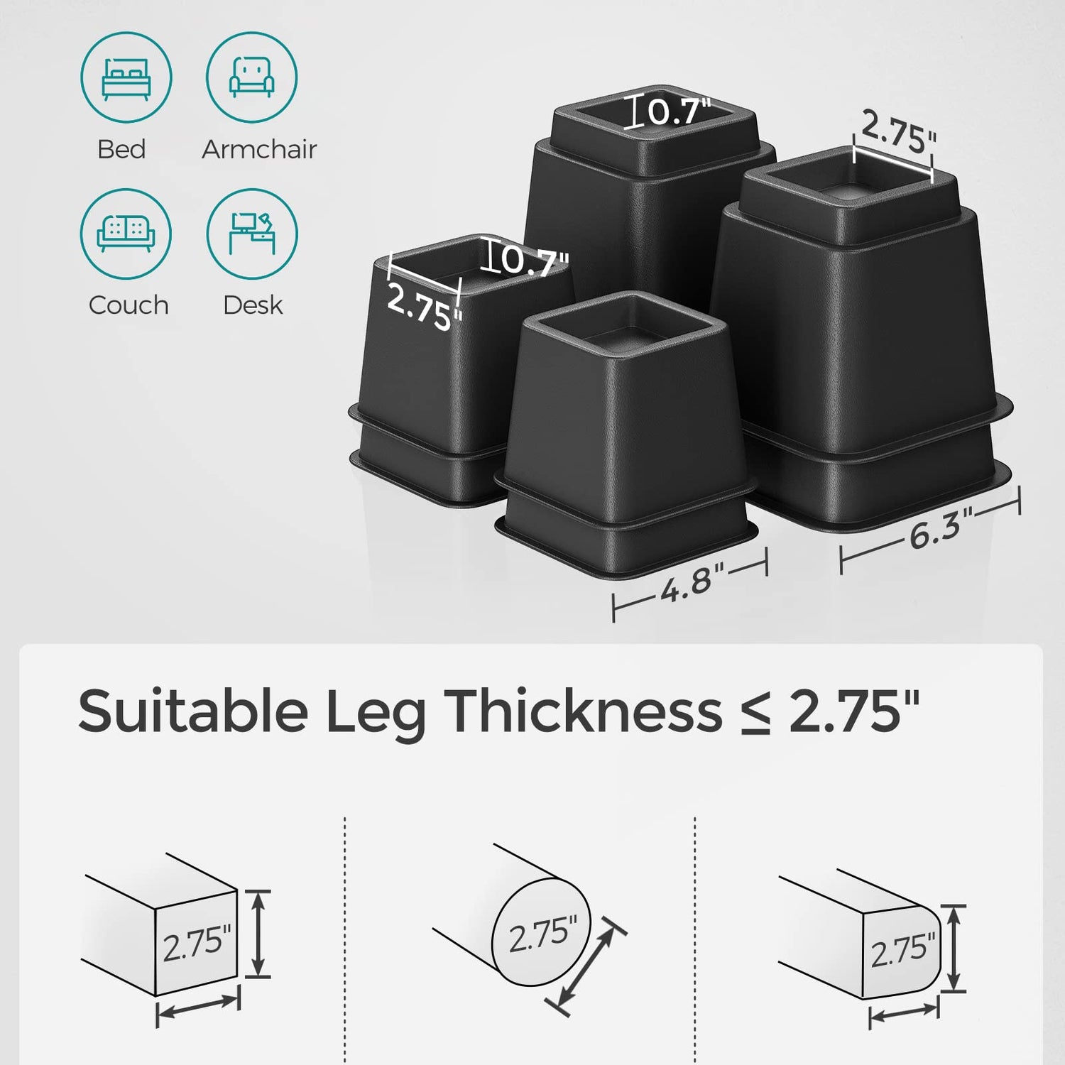 - [Small Tips] These bed lift risers are not suitable for recliners or beds with wheels; also, please make sure the furniture legs are not thicker than 2.8” to ensure a secure fit and a steady base without collapsing or sliding