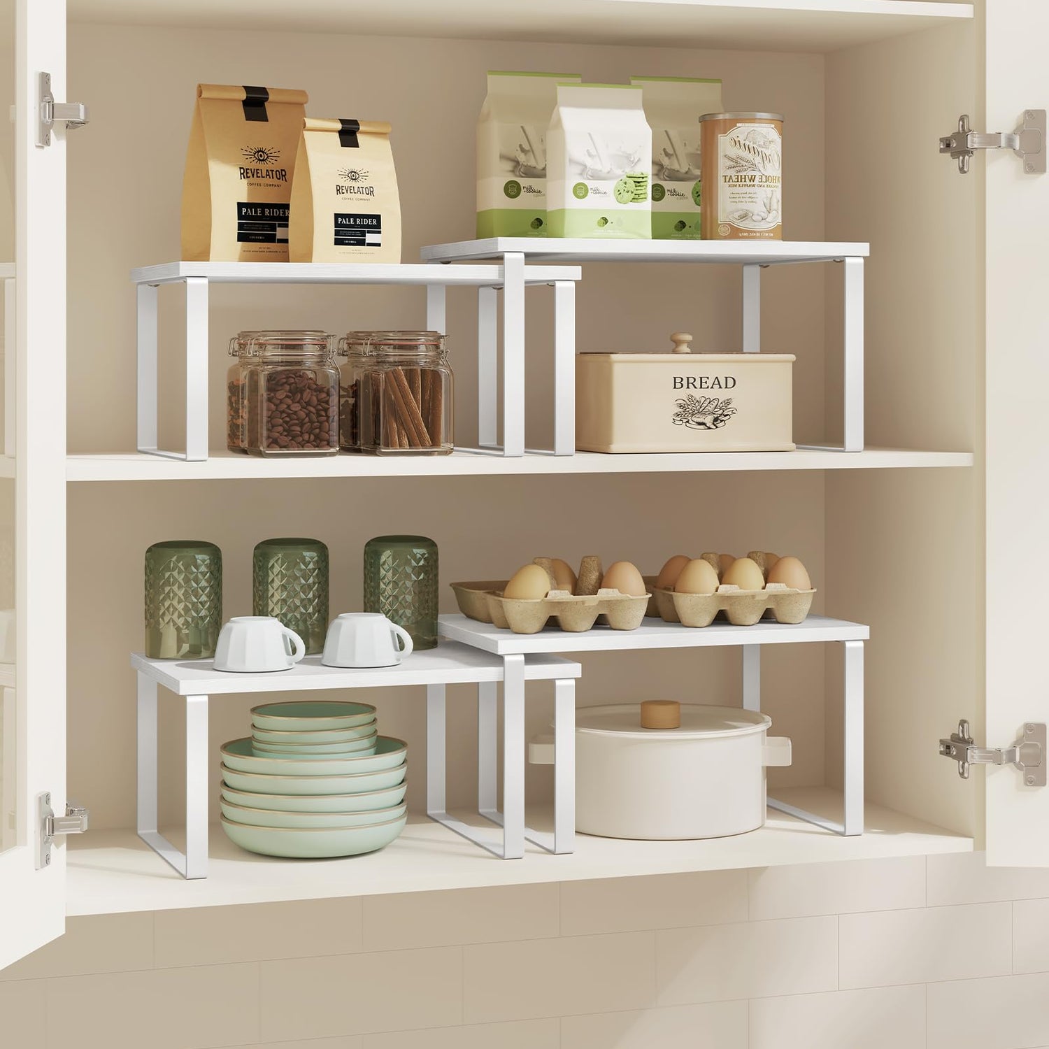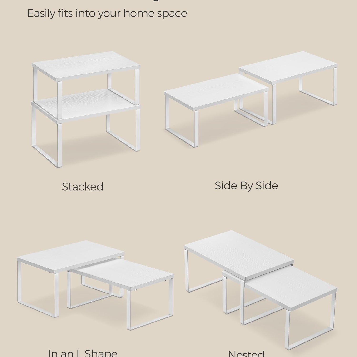 - [Adjustable] With their unique design, with one slightly smaller than the other, these shelf organizers can be stacked on top of one another, nested, used separately, or even in an L-shape. Adjust them how you want to perfectly fit your kitchen space
