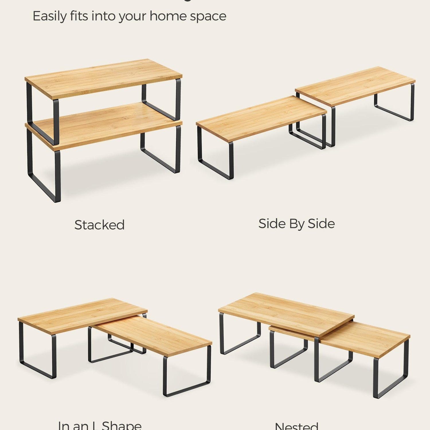 - [Adjustable] With their unique design, with one slightly smaller than the other, these shelf organizers can be stacked on top of one another, nested, used separately, or even in an L-shape. Adjust them how you want to perfectly fit your kitchen space