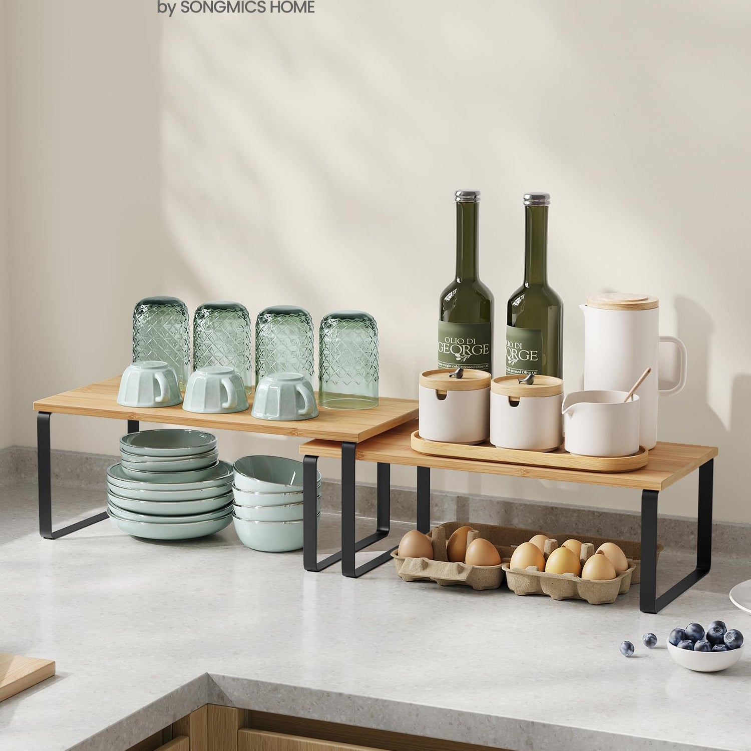 SONGMICS Cabinet Organizer Shelf, Set of 2 Kitchen Counter Shelves, Kitchen Storage, Spice Rack, Stackable, Expandable, Metal and Engineered Wood, Ink Black and Natural Beige UKCS200B01