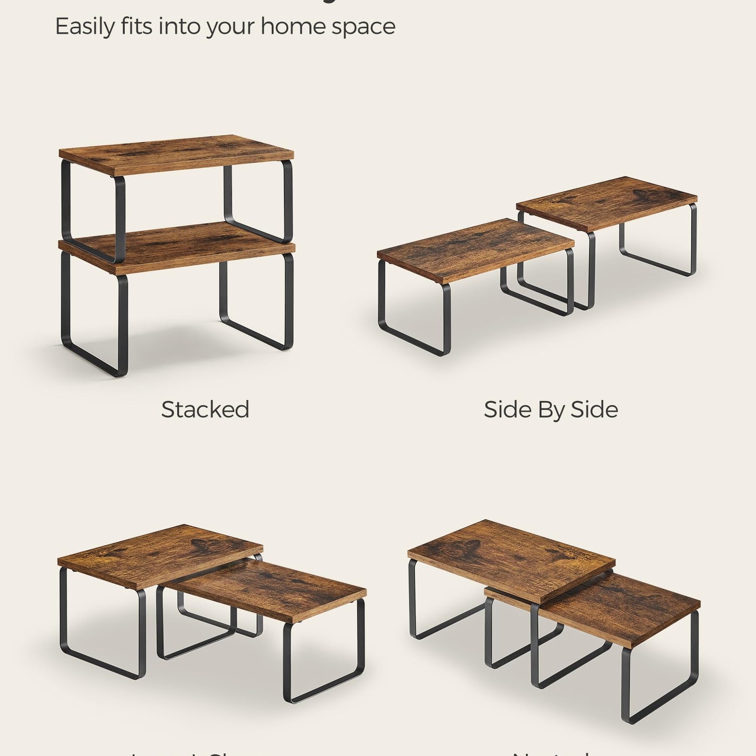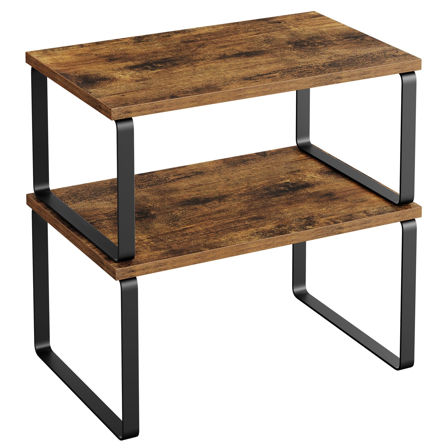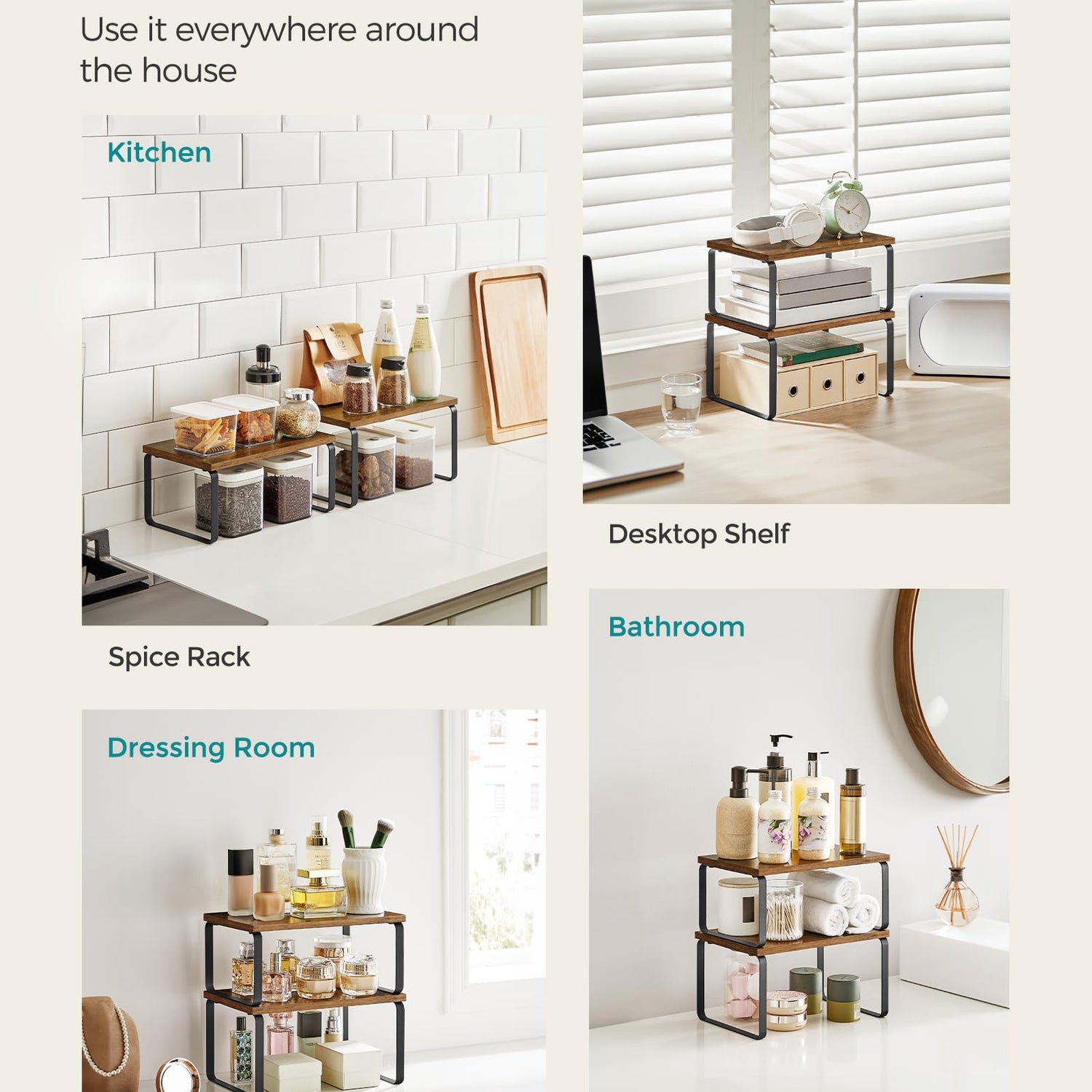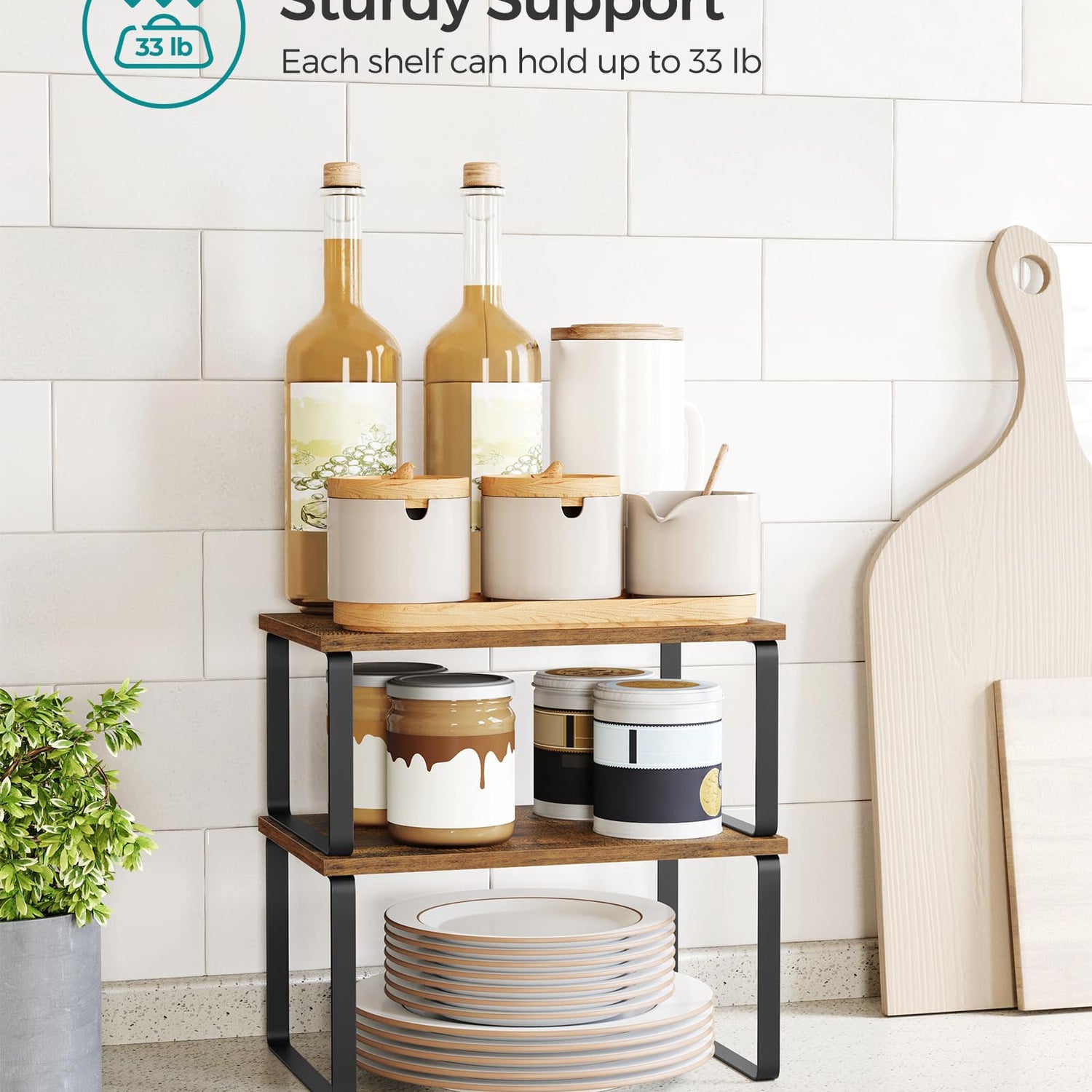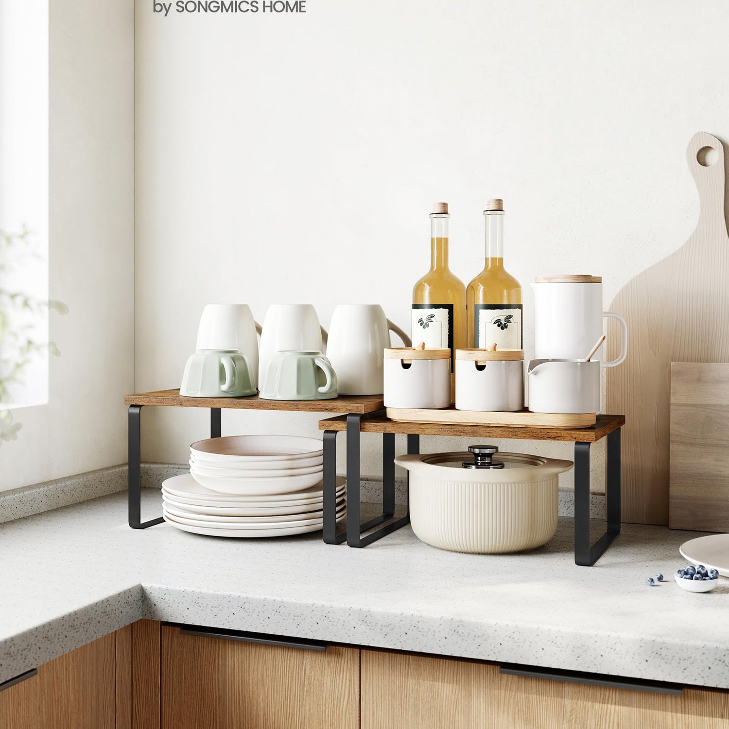 SONGMICS Cabinet Organizer Shelf, Set of 2 Kitchen Counter Shelves, Kitchen Storage, Spice Rack, Stackable, Expandable, Metal and Engineered Wood, Ink Black and Rustic Brown UKCS020X01