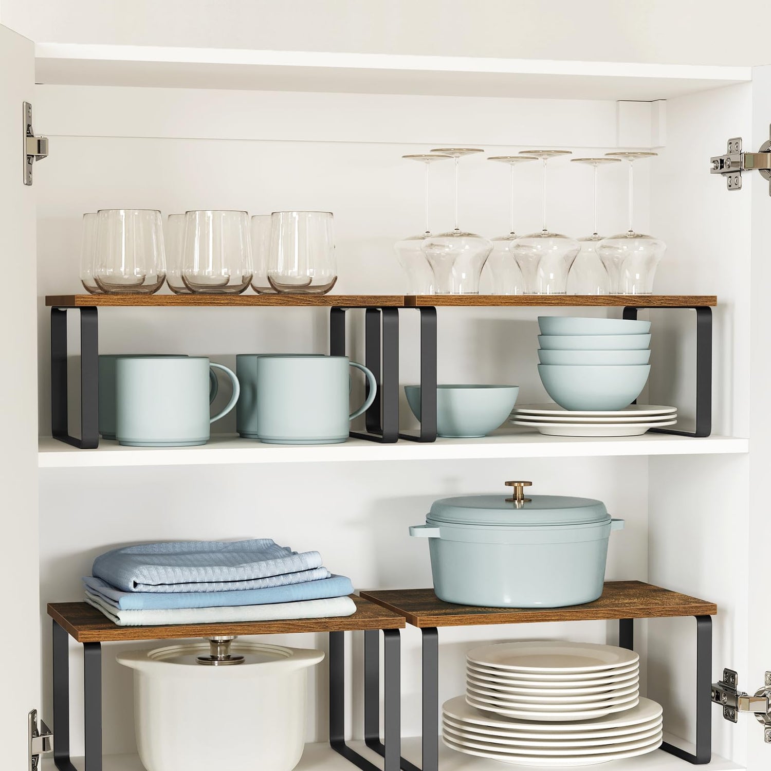- [Adjustable] With their unique design, with one slightly smaller than the other, these shelf organizers can be stacked on top of one another, nested, used separately, or even in an L-shape. Adjust them how you want to perfectly fit your kitchen space