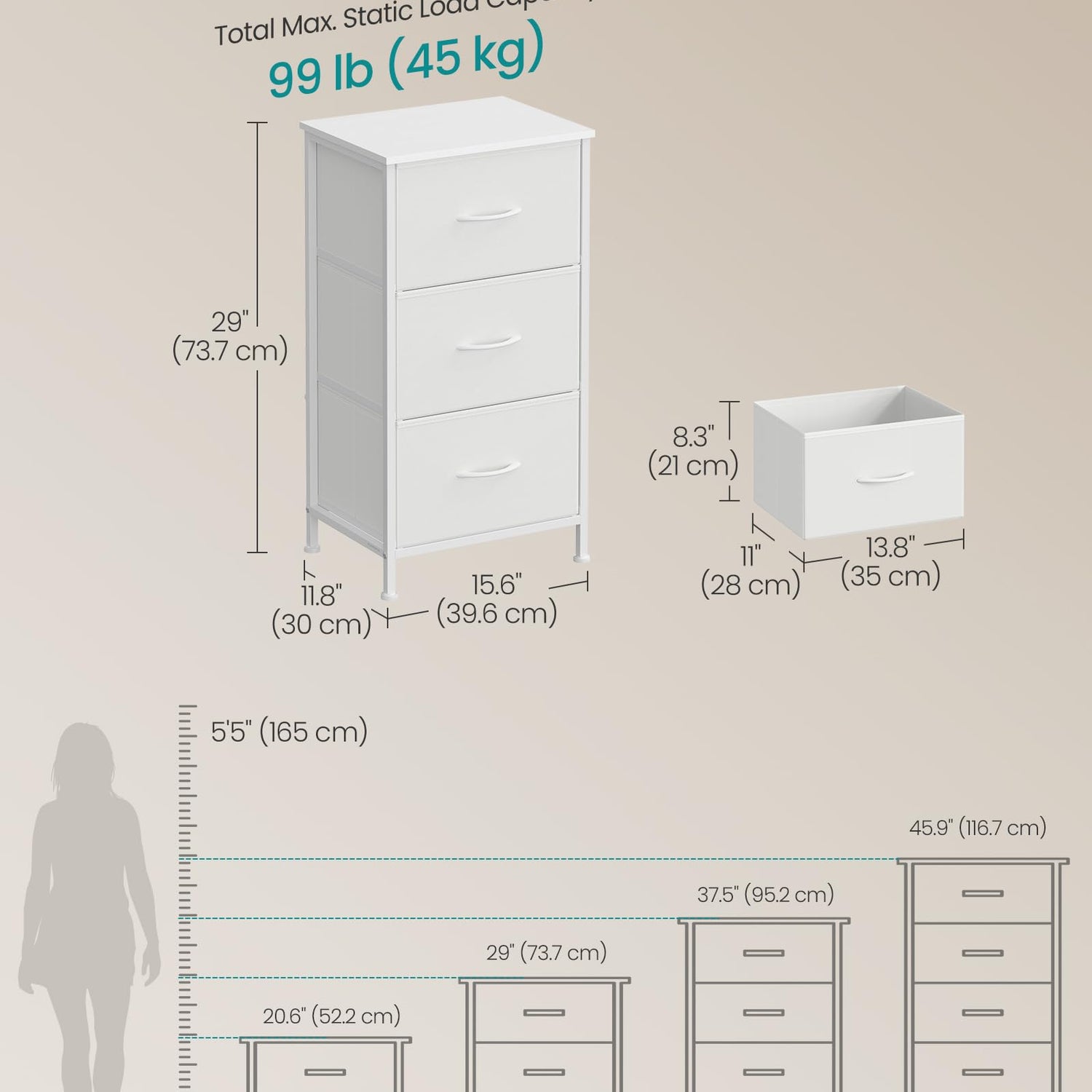 - Solid Construction: Crafted with a steel frame, particleboard top, and non-woven fabric drawers with MDF structures, this drawer tower is durable and sturdy, with the top holding up to 66 lb and each drawer up to 11 lb