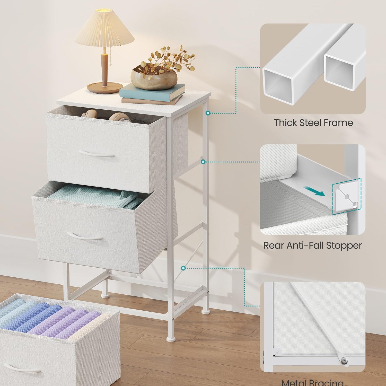 - Stability and Safety Ensured: This fabric dresser comes with adjustable feet to prevent wobbles on slightly uneven floors and an anti-tip kit for safety, ensuring peace of mind